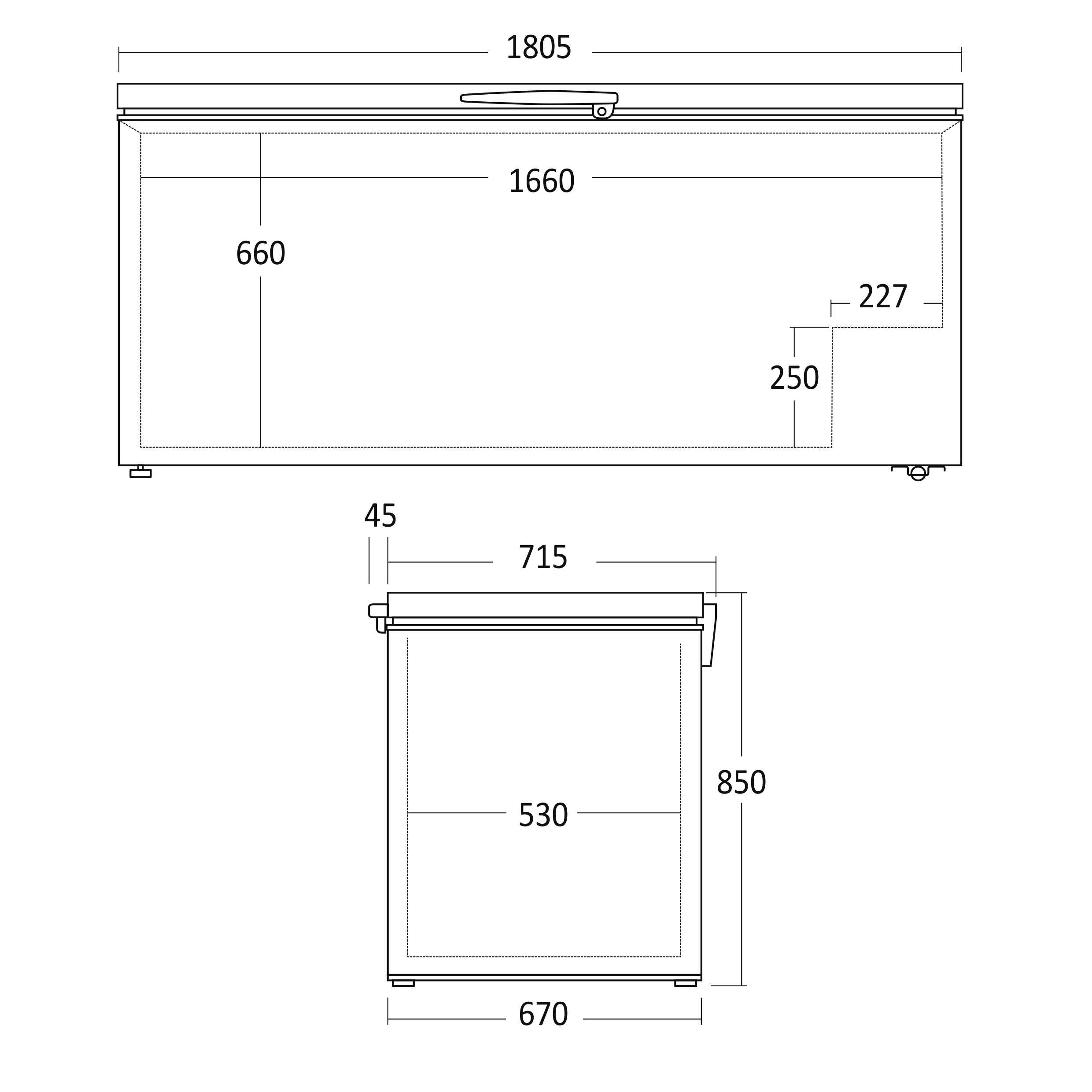 Indvendige mål, HxBxD, mm: 670 x 1663 x 530