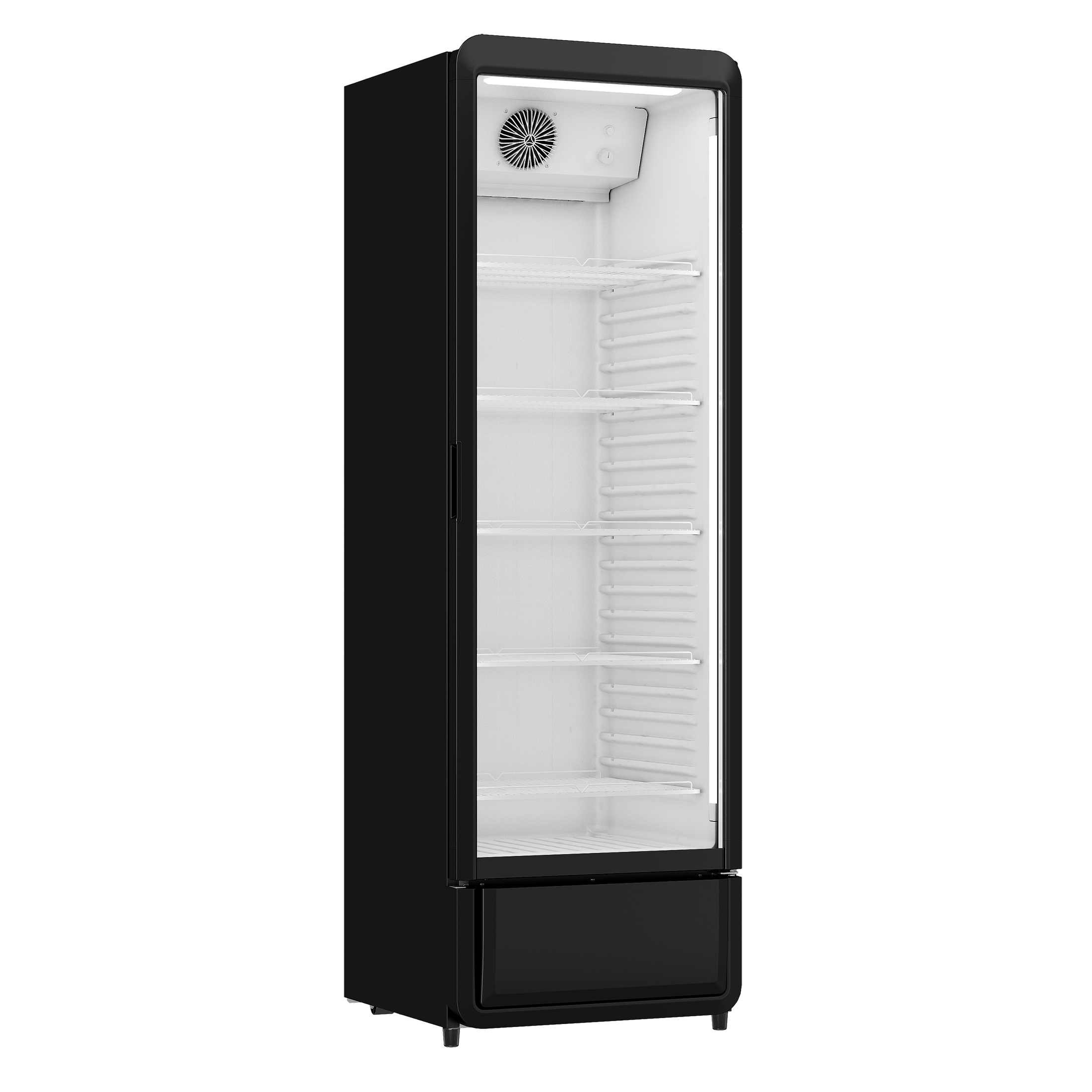 DC380BD er et stort 1-dørs displaykøleskab i sort med 377 nettoliter køleplads.