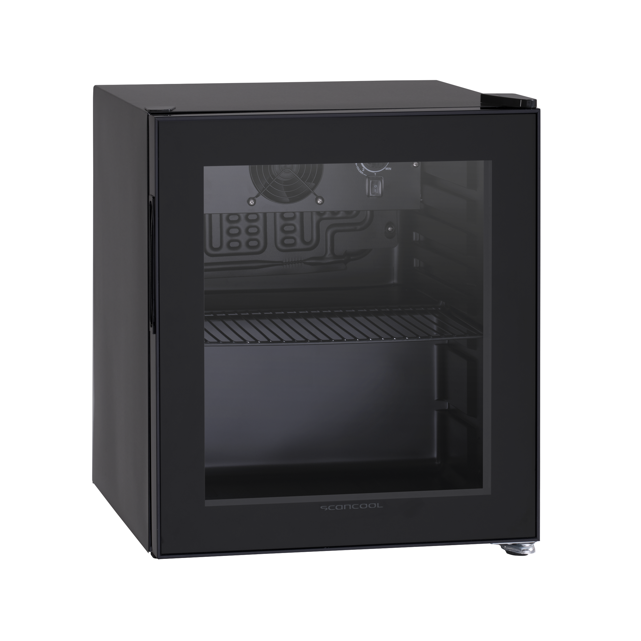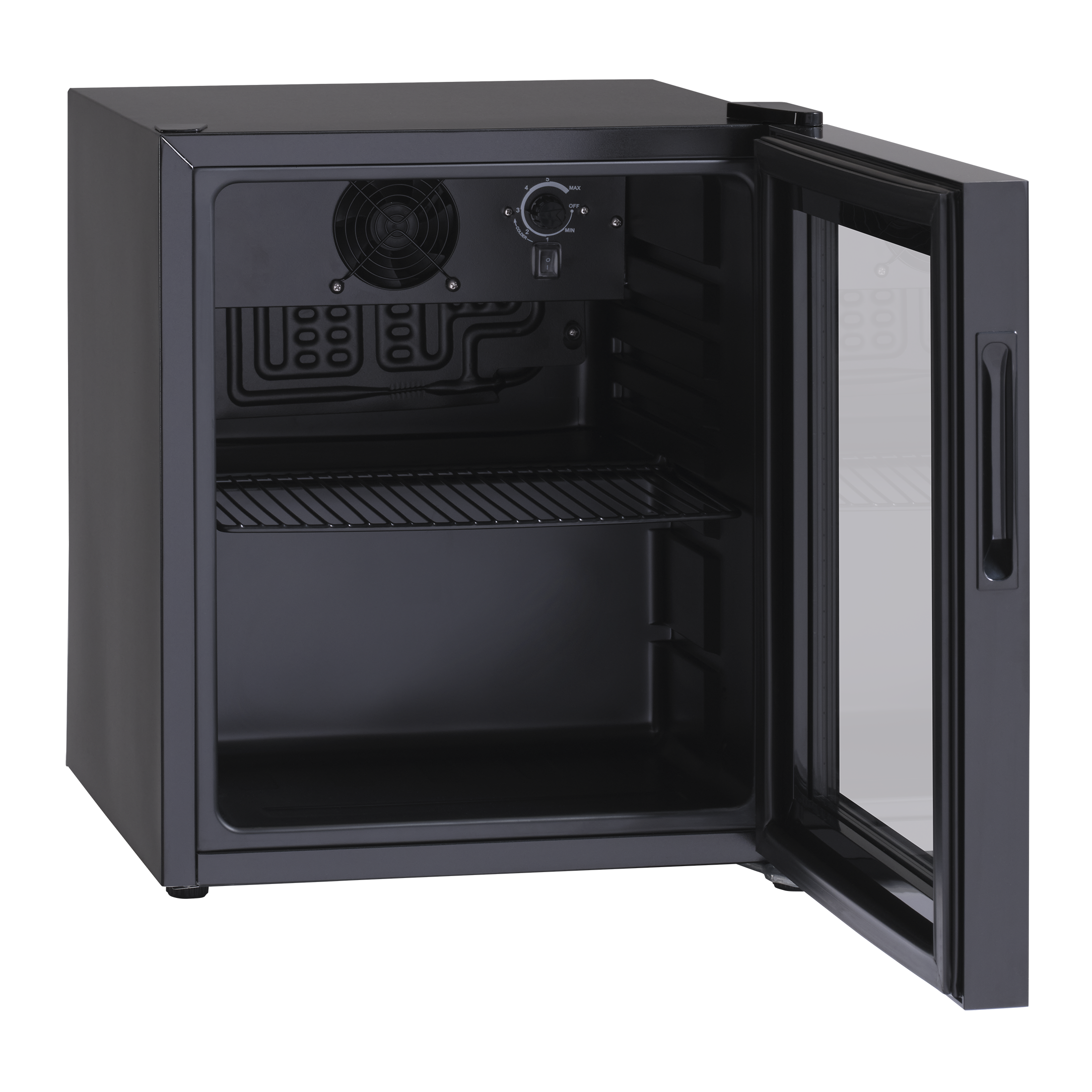 Sort skab med sort glasdør med tynd ramme. Leveres med 1 sort trådhylde, som er justerbar og dermed sikrer, at alle typer glas, dåser og flasker kan passe ind i skabet og stå stabilt på hylderne. Hylderne har en maksimal kapacitet på 12 kg. Skabet har 4 justerbare fødder, så det står stabilt på alle overflader. Skabet har en hængslet dør, der er hængslet i højre side.