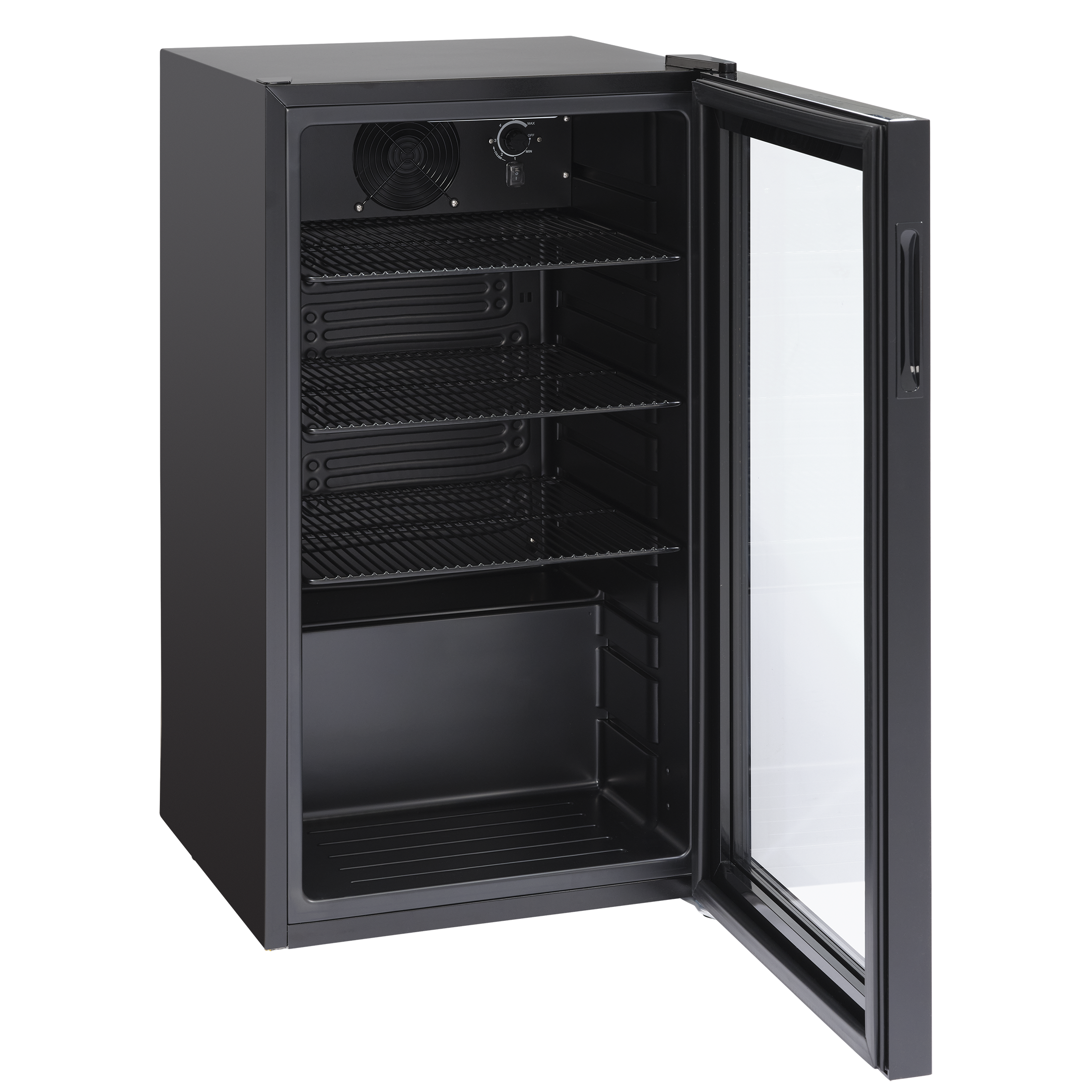 Sort skab med sort glasdør med tynd ramme. Leveres med 3+1 sort trådhylde, som er justerbar og dermed sikrer, at alle typer glas, dåser og flasker kan passe ind i skabet og stå stabilt på hylderne. Hylderne har en maksimal kapacitet på 26 kg. Skabet har 2 justerbare fødder i front, så det står stabilt på alle overflader. Skabet har en hængslet dør, der er hængslet i højre side.