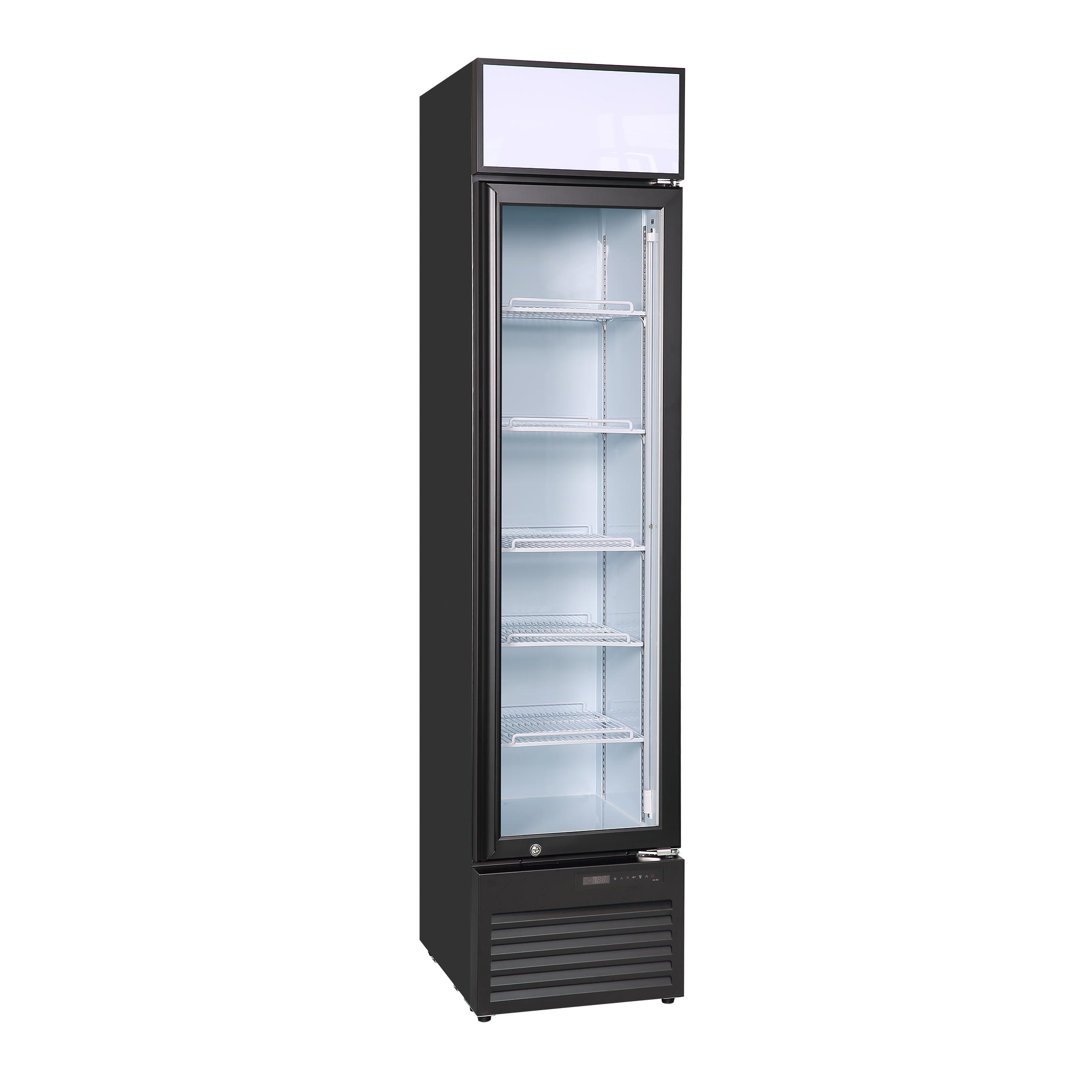 Det slanke design med sort aluminiumsdør og integreret håndtag giver et professionelt og moderne udtryk. Køleren passer nemt ind i salgsområder, hvor både plads, funktionalitet og et stilrent look er vigtigt.