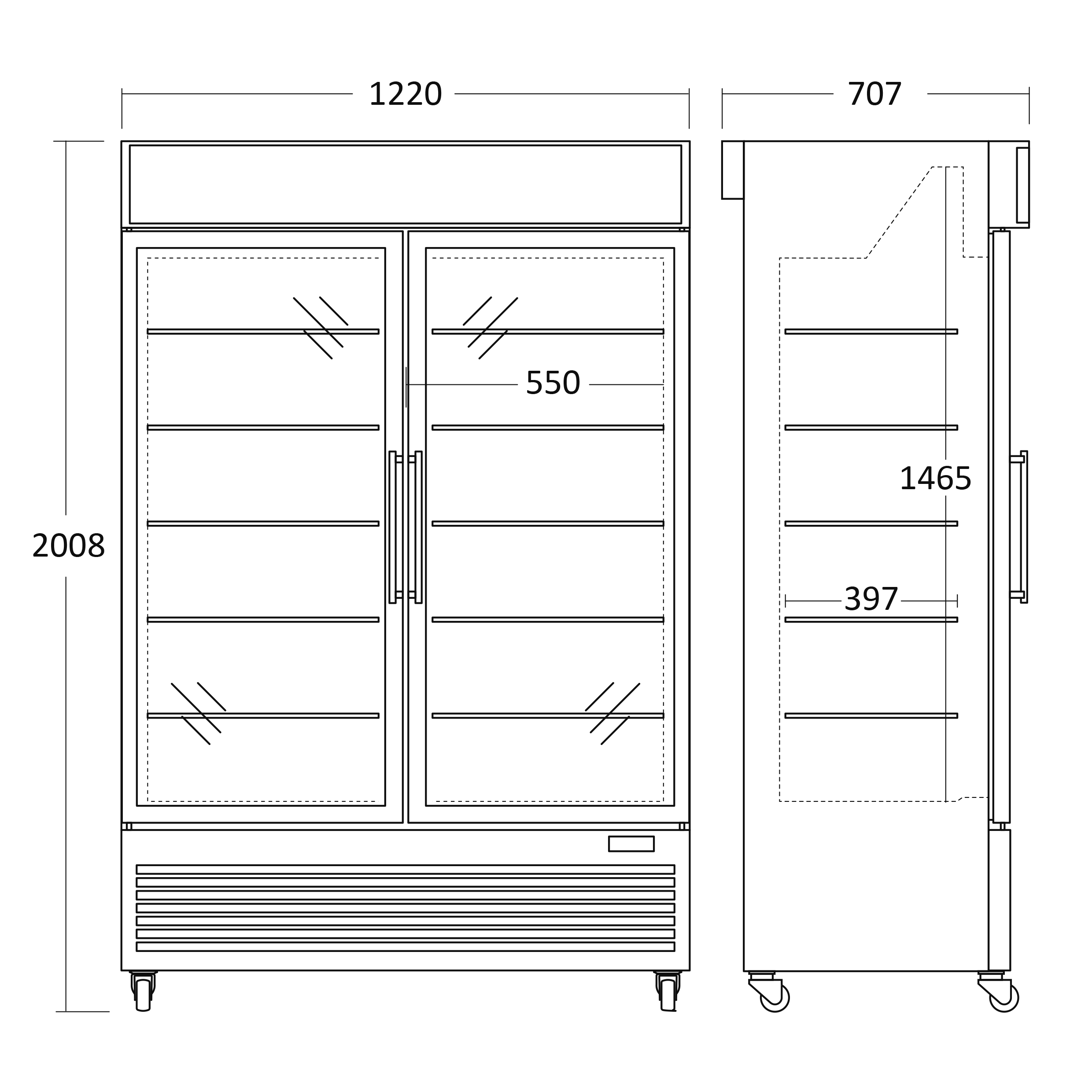 DF800BE er et stort 2-dørs display fryseskab, med 800 netto liter fryserum.