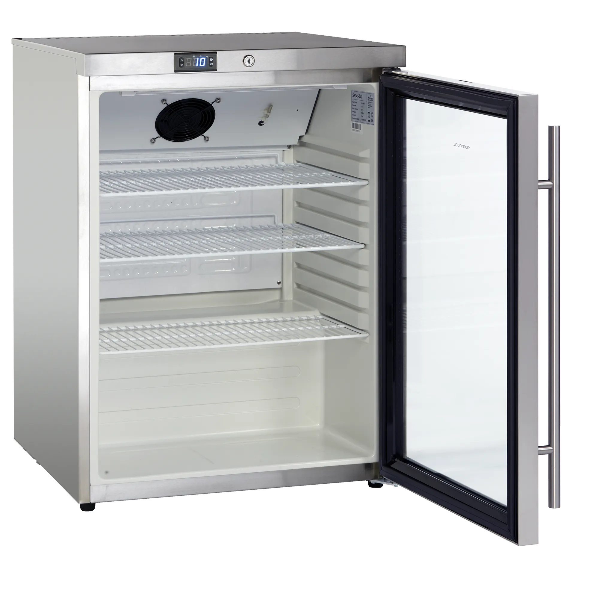 SK 145 GDE is a 1-door storage refrigerator, with stainless steel cabinet and glass door of 145 net liters.