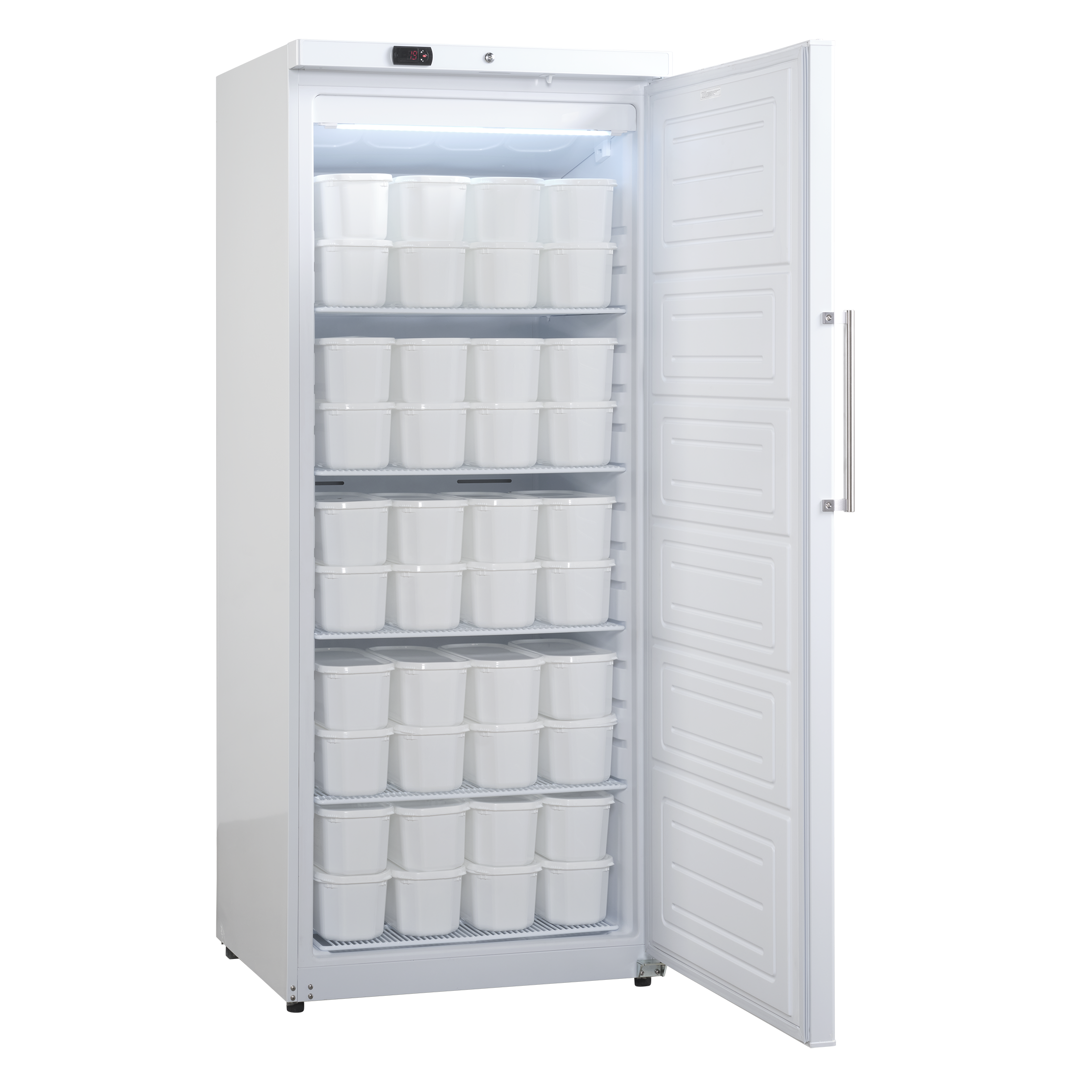 GUF590 W er et fryseskab med fuld dør på 510 nettoliter med vendbar dør og robust stålhåndtag.