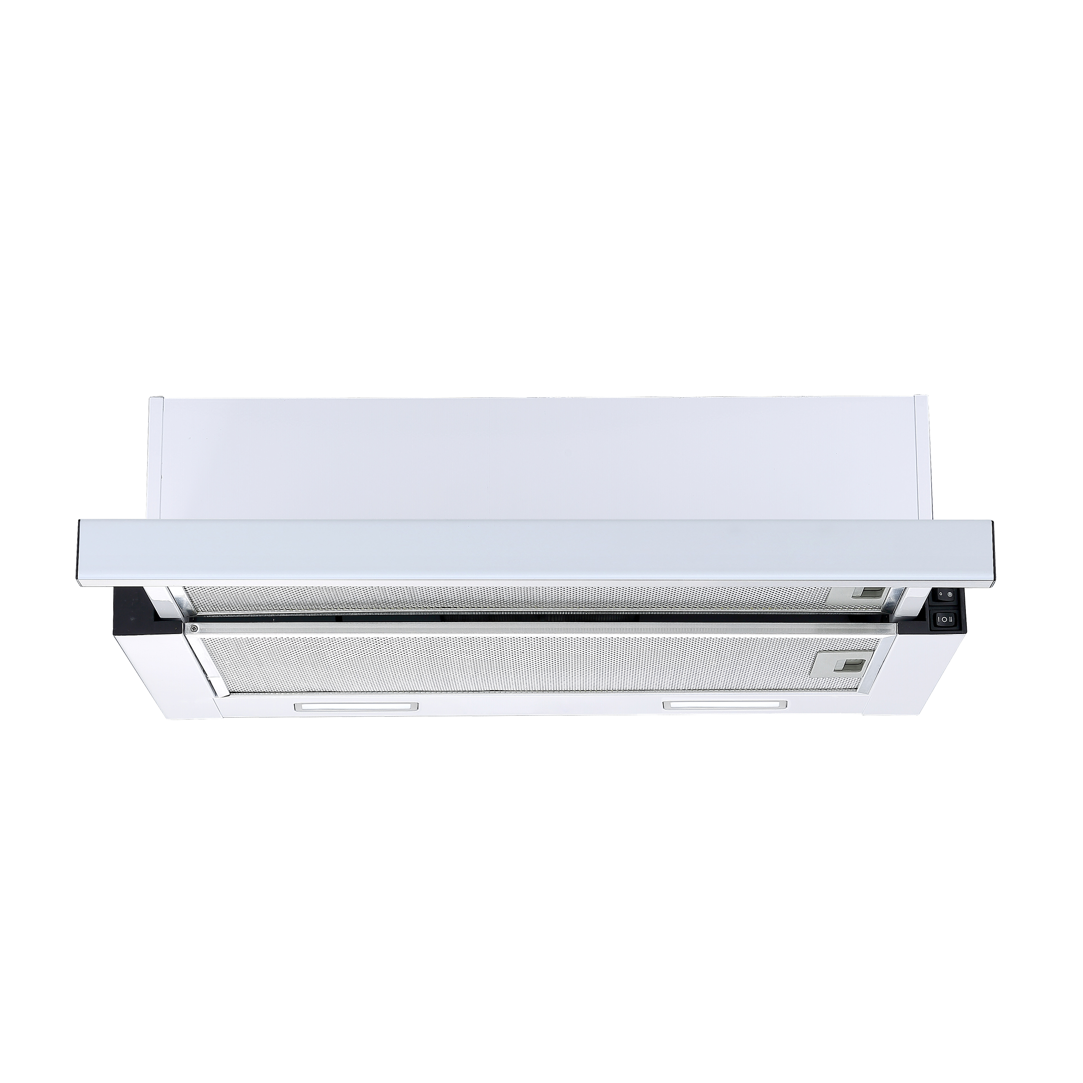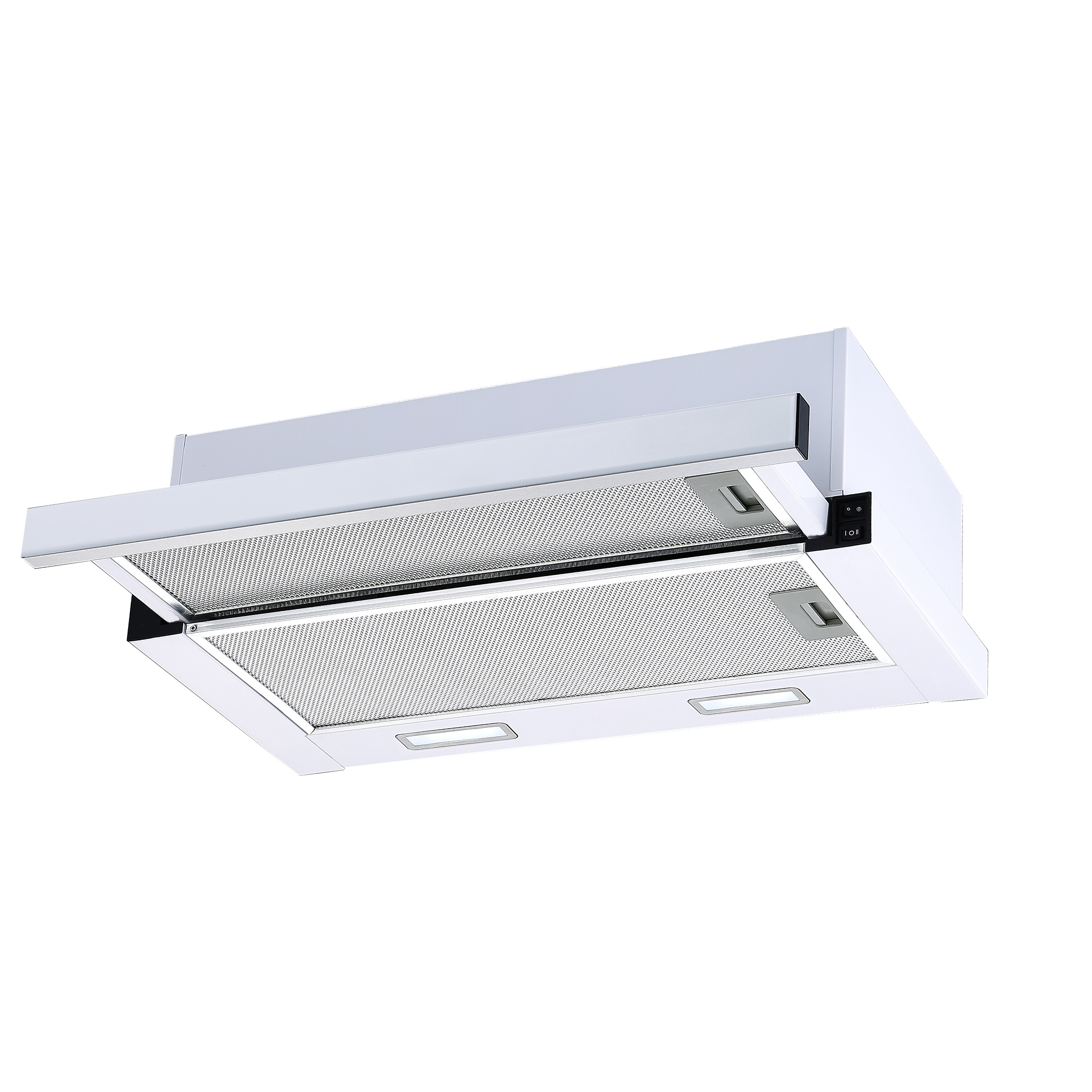 Med intern motor og udskiftelig front, stål eller hvid, begge medfølger.