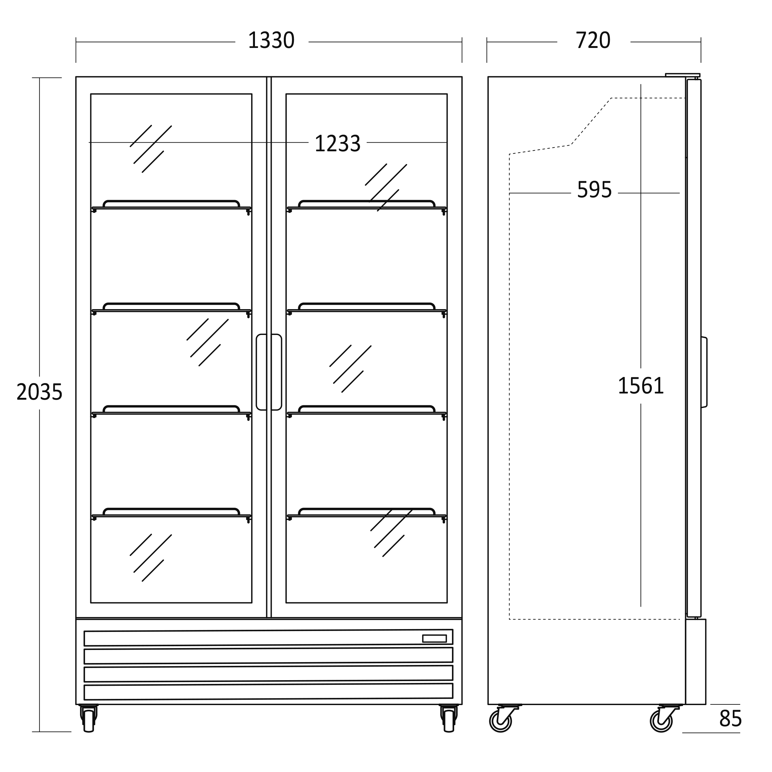 SD 1326 BE er et stort 2-dørs display køleskab, med hele 1098 netto liter kølerum.