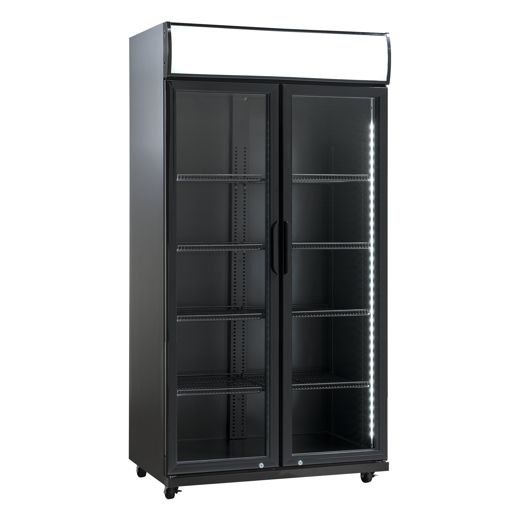 SD 881 BE er et stort 2-dørs display køleskab, med 569 netto liter kølerum.