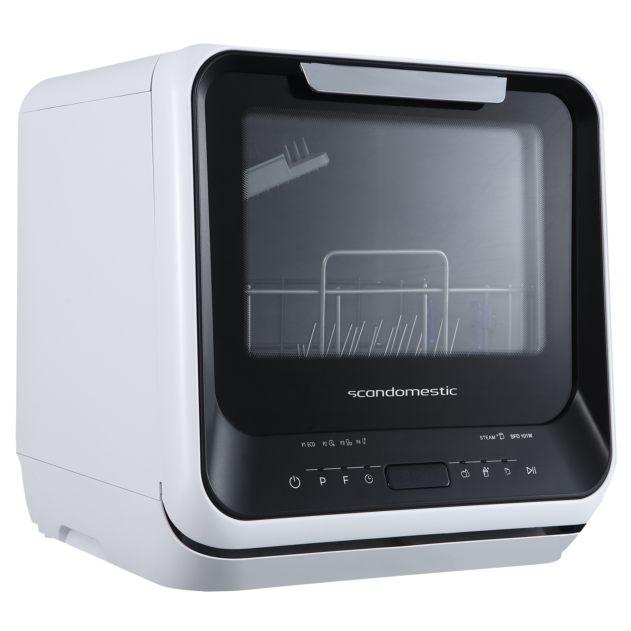 SFO 101 W er en lille smart bordmodel til 2 kuverter som er fritstående, uden fast vandtilslutning og afløb. Maskinen vasker op, kun ved brug af 5 liter vand. Maskinens størrelse gør den nem at placere alle steder på bordet og kan nemt flyttes til vasken eller andre steder for vandafløb når den tages i brug.