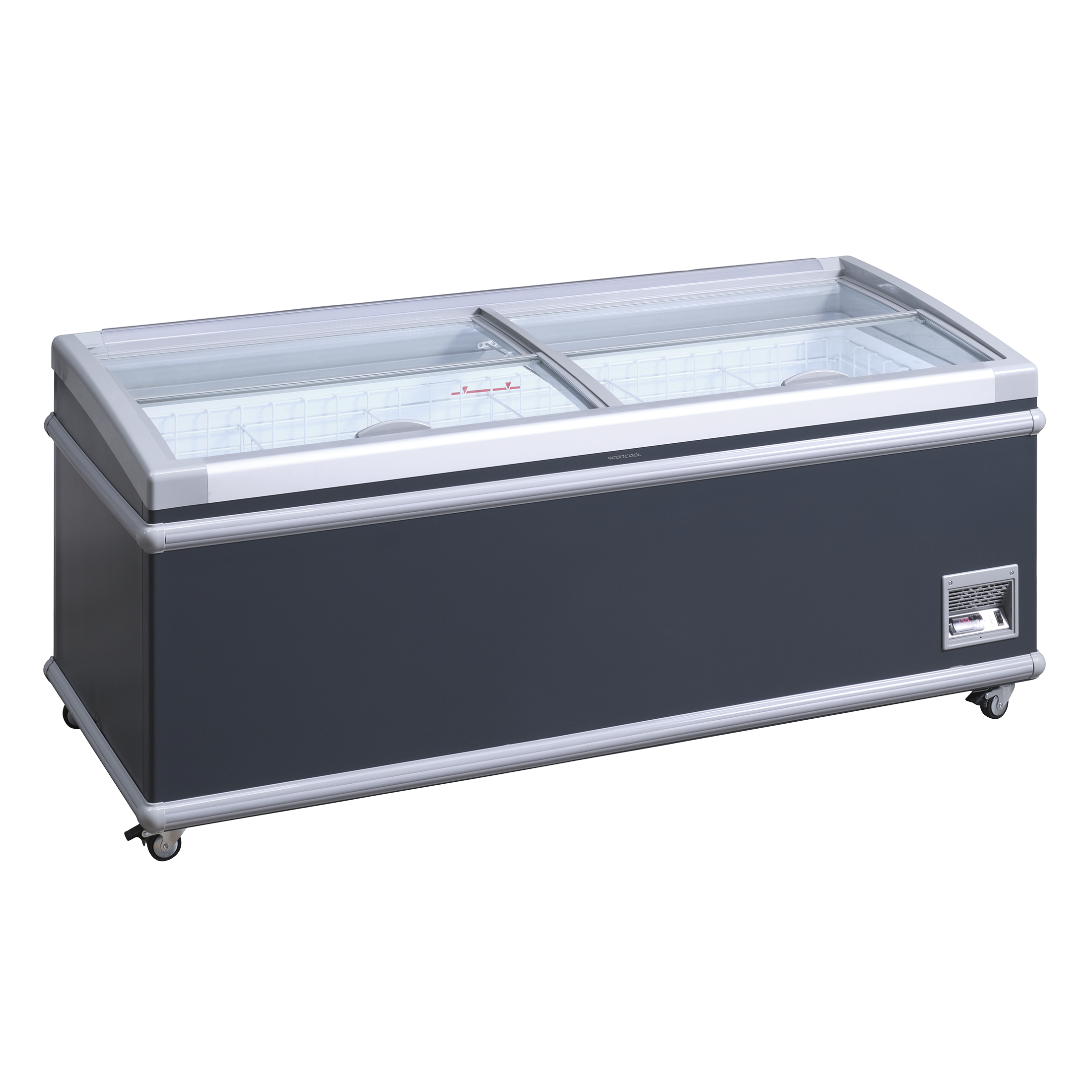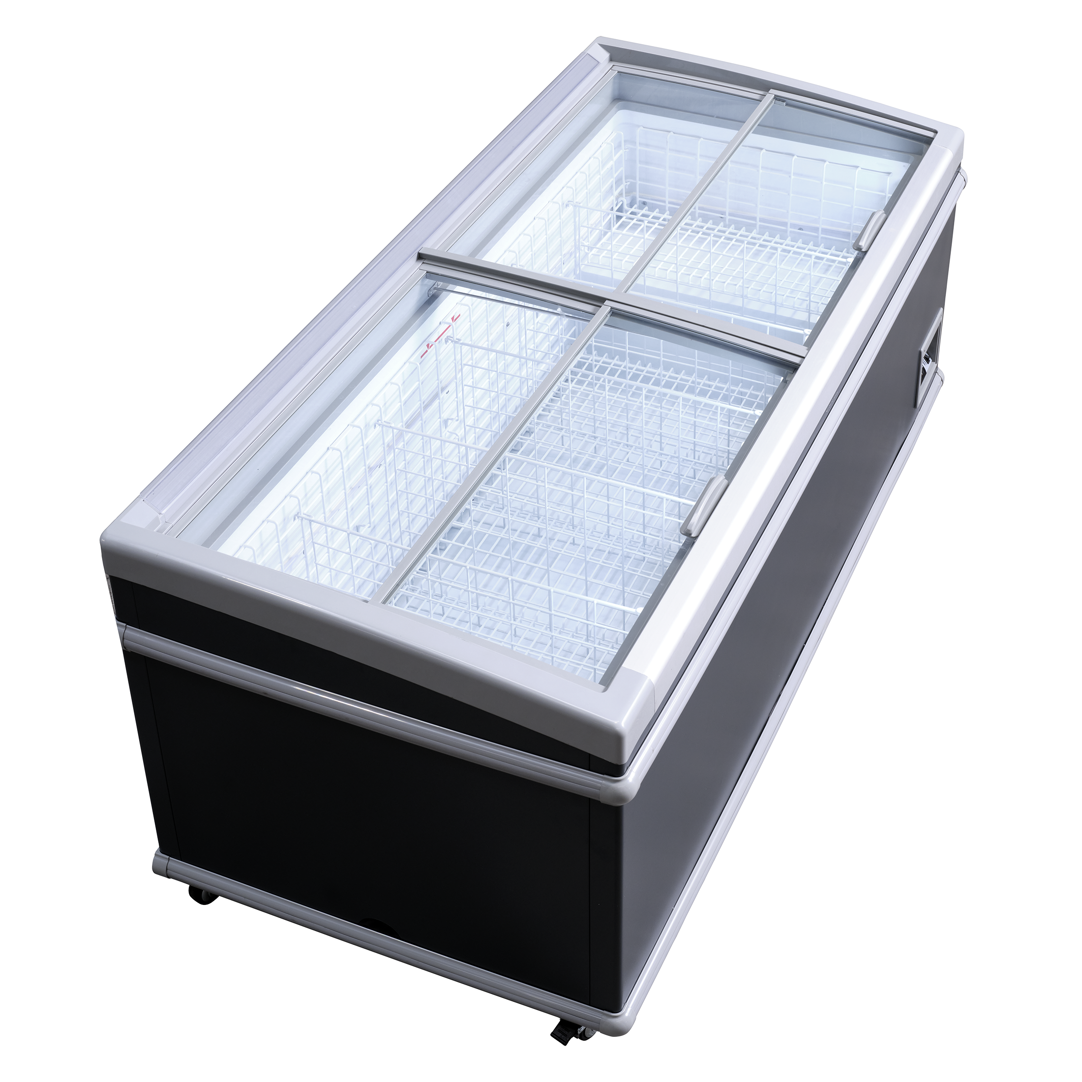 Fryseren leveres med buede transparente låg som holder ekstra på kulden og med stærkt aluminiumshåndtag.