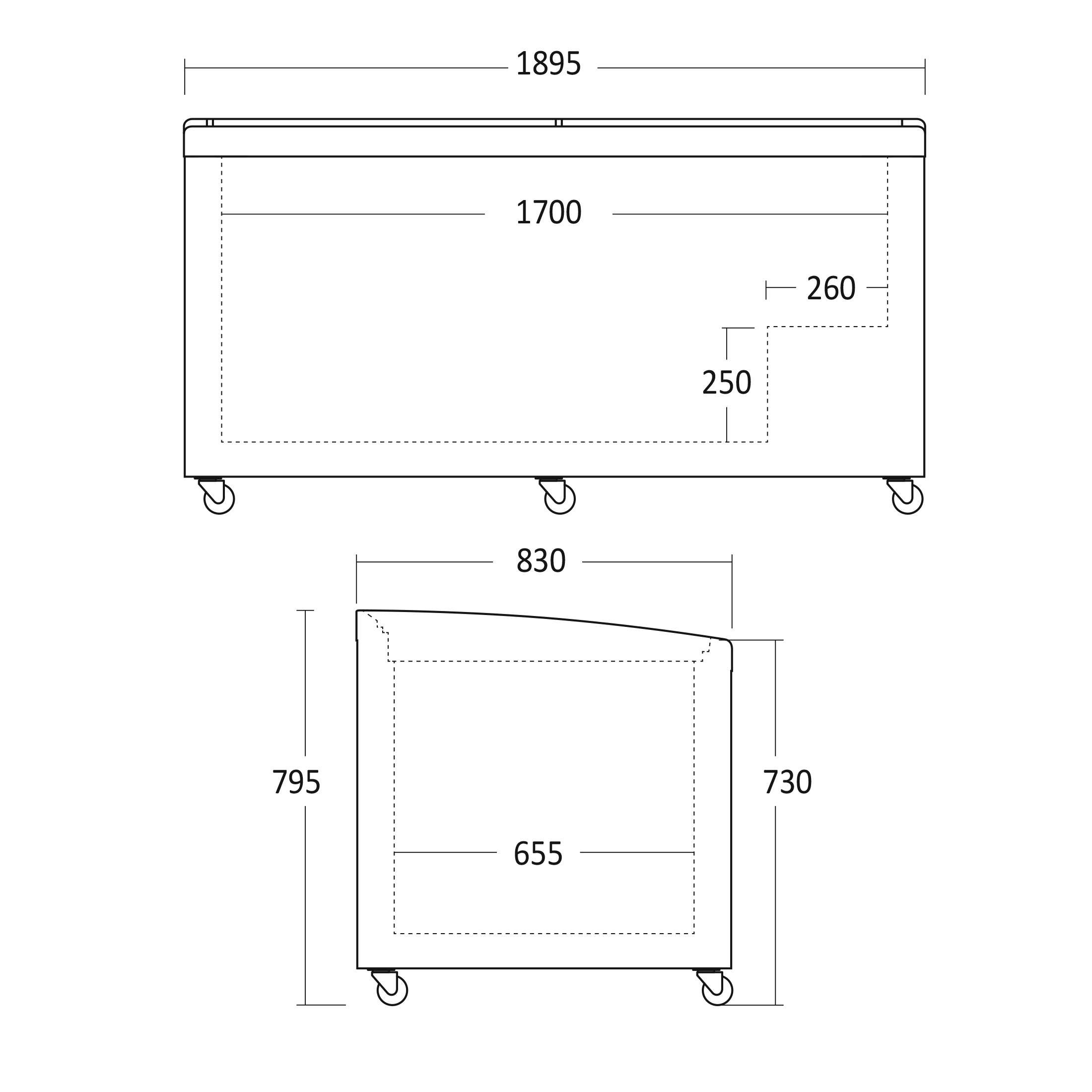 Indvendige mål, HxBxD, mm: 525 x 1700 x 655