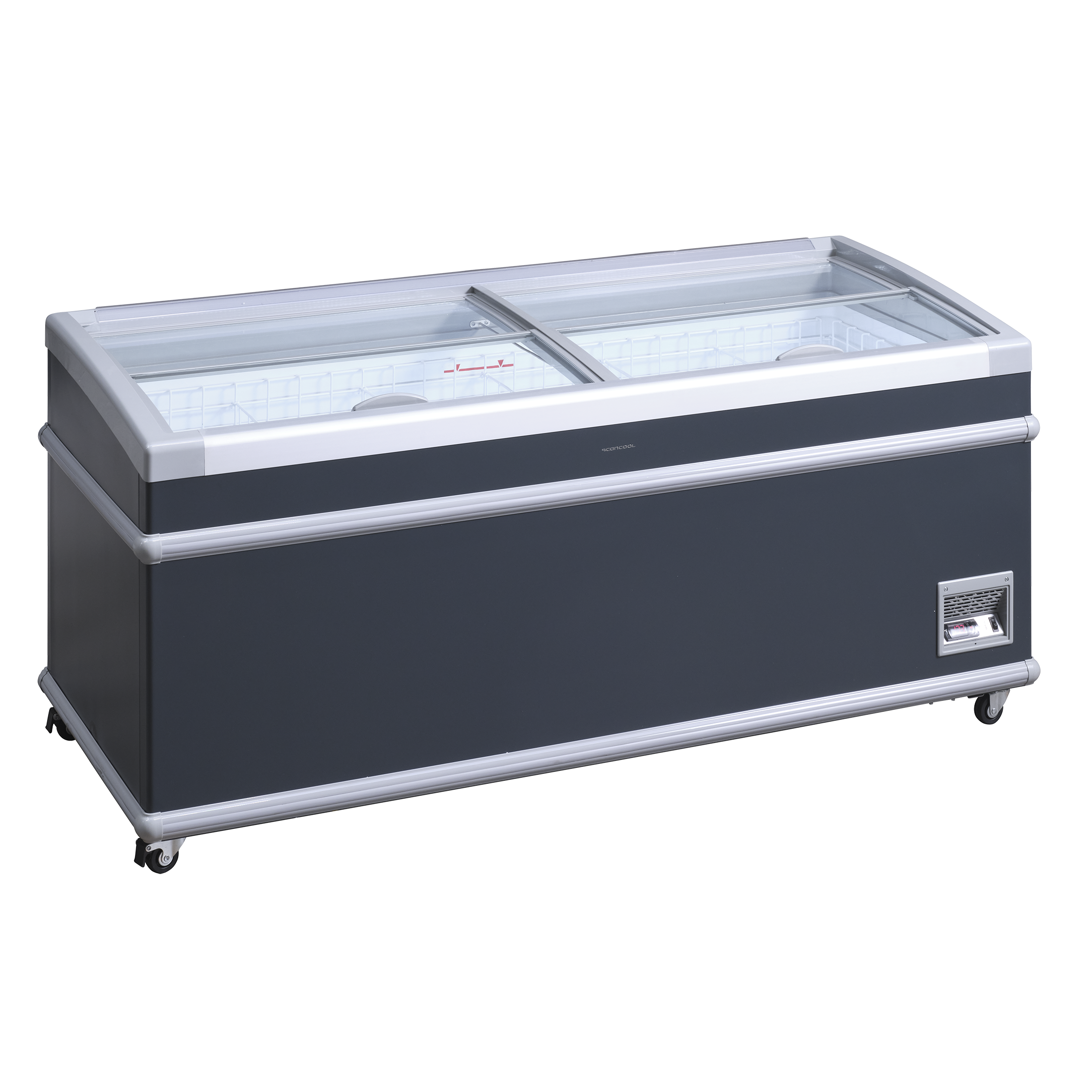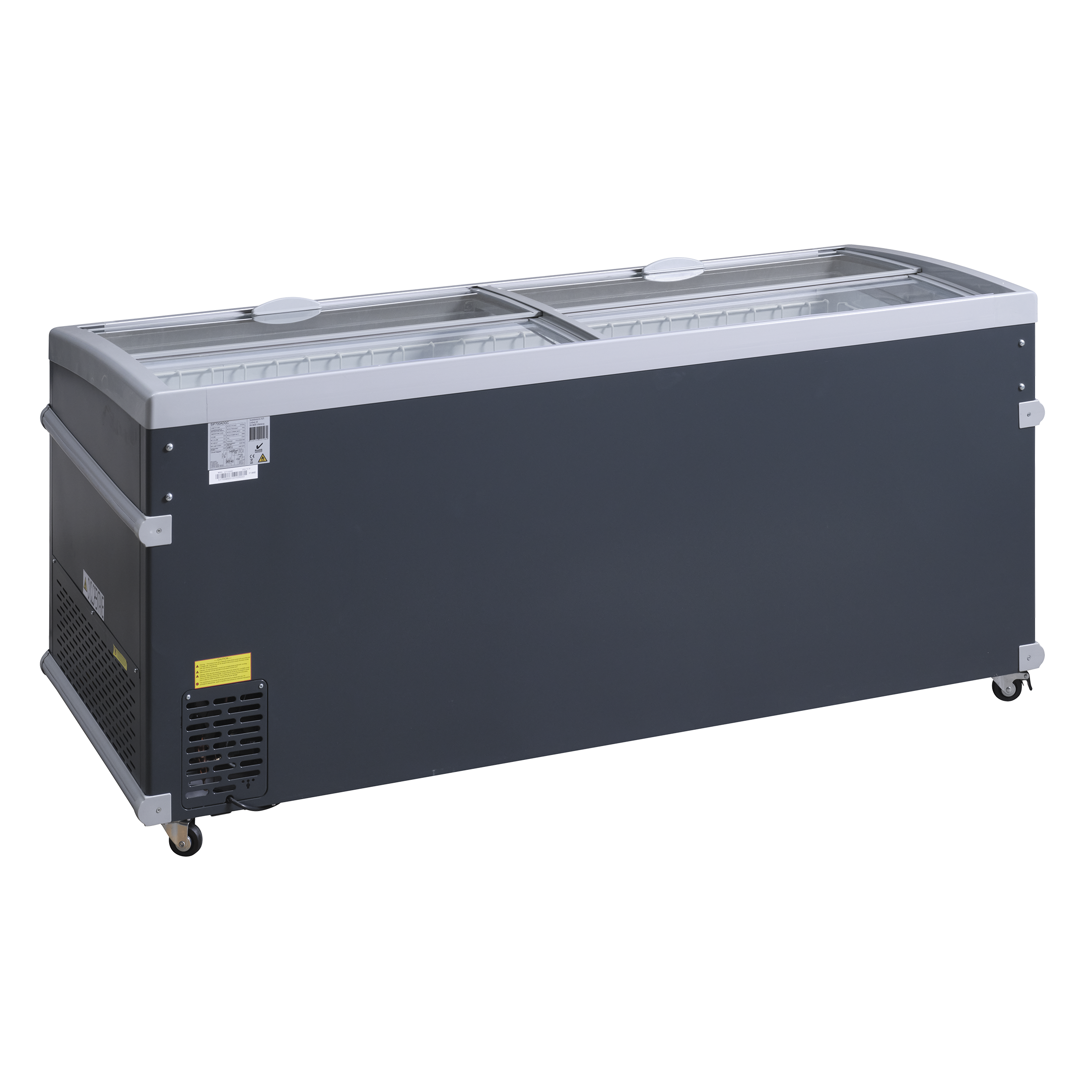 Fryseren leveres med buede transparente skydelåg som holder ekstra på kulden og med stærkt aluminiumshåndtag.