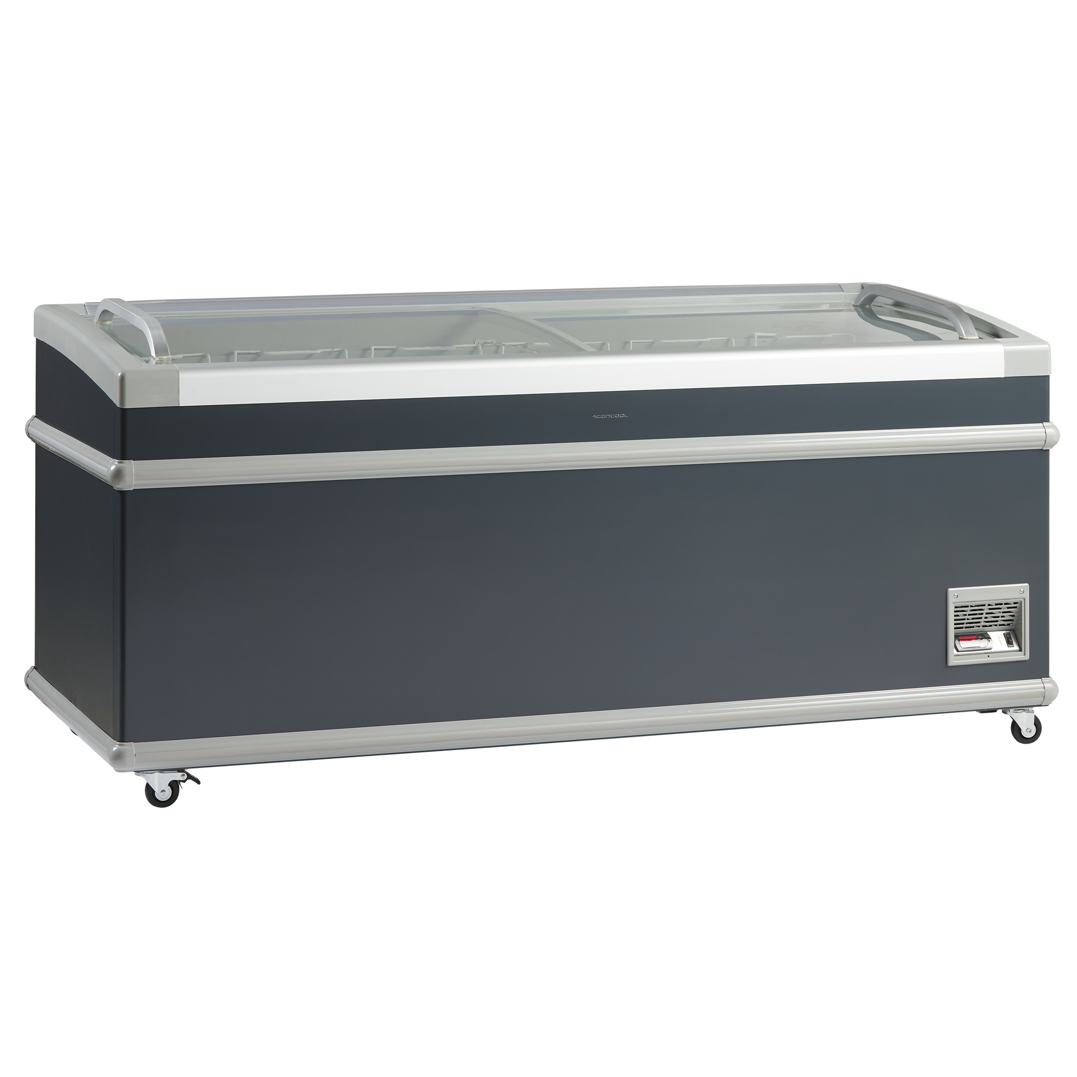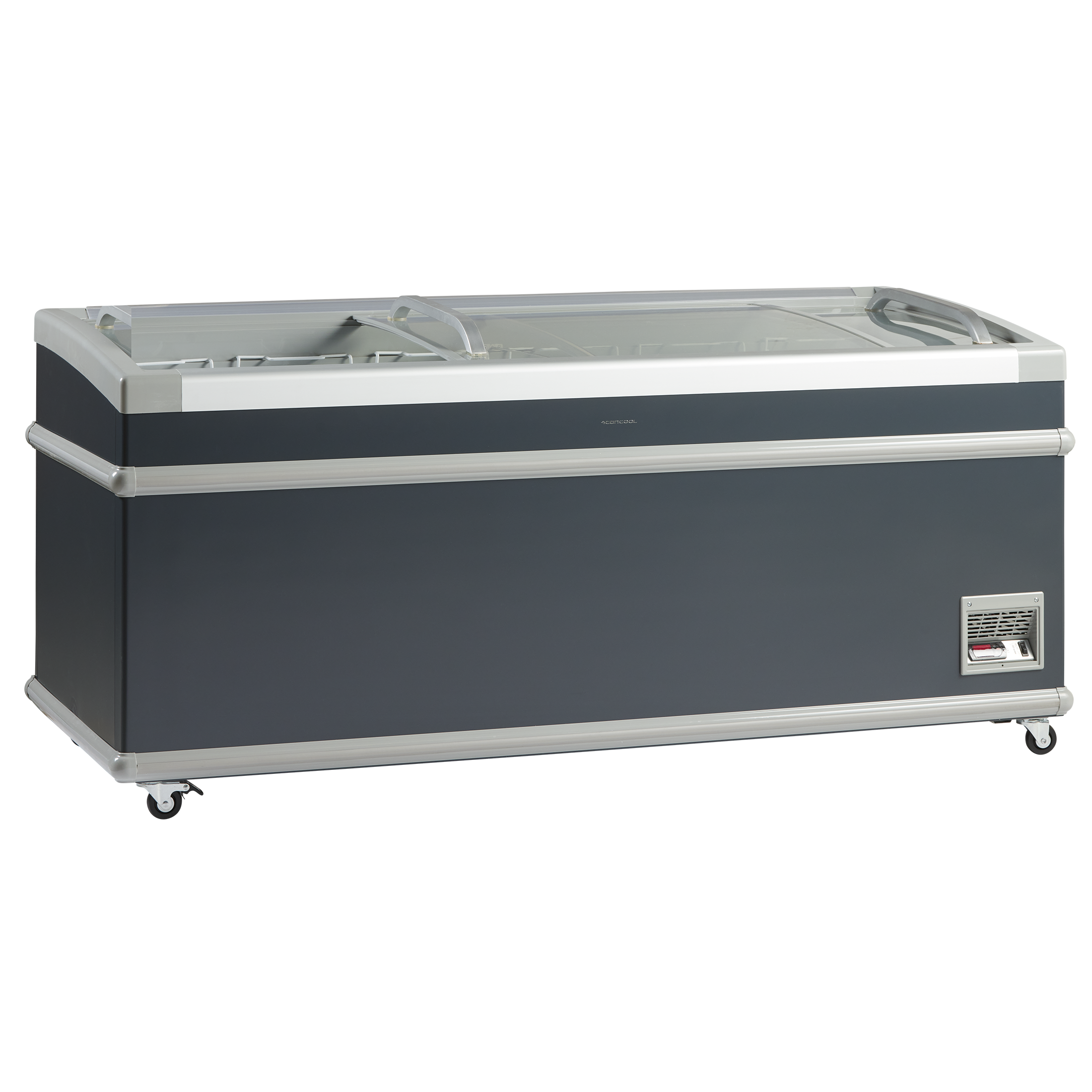 Fryseren leveres med buede transparente skydelåg som holder ekstra på kulden og med stærkt aluminiumshåndtag.