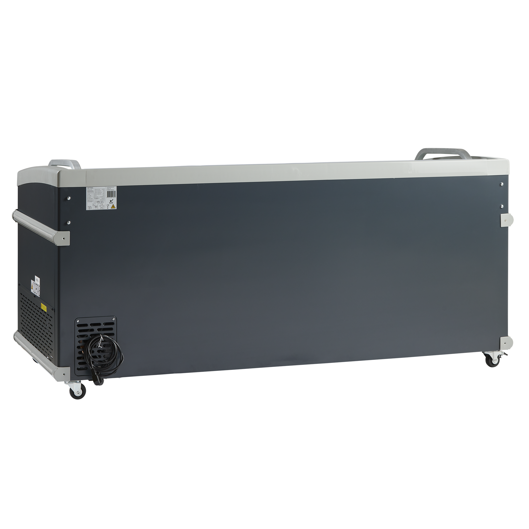 SIF700C er mørkegrå med lysegrå fenderlister og har 4 hjul heraf 2 med bremser og kan dermed flyttes rundt, også selv om den er fyldt op.