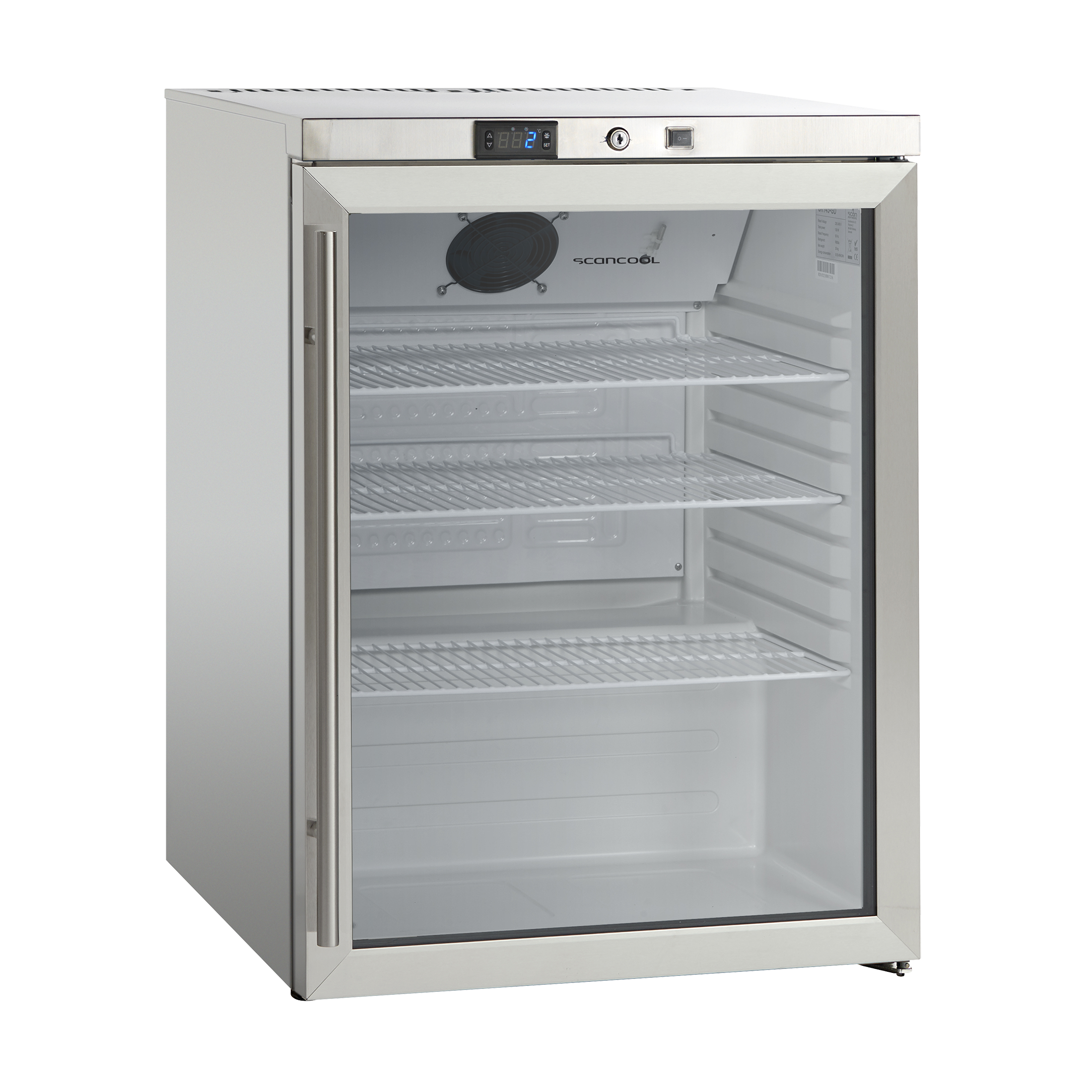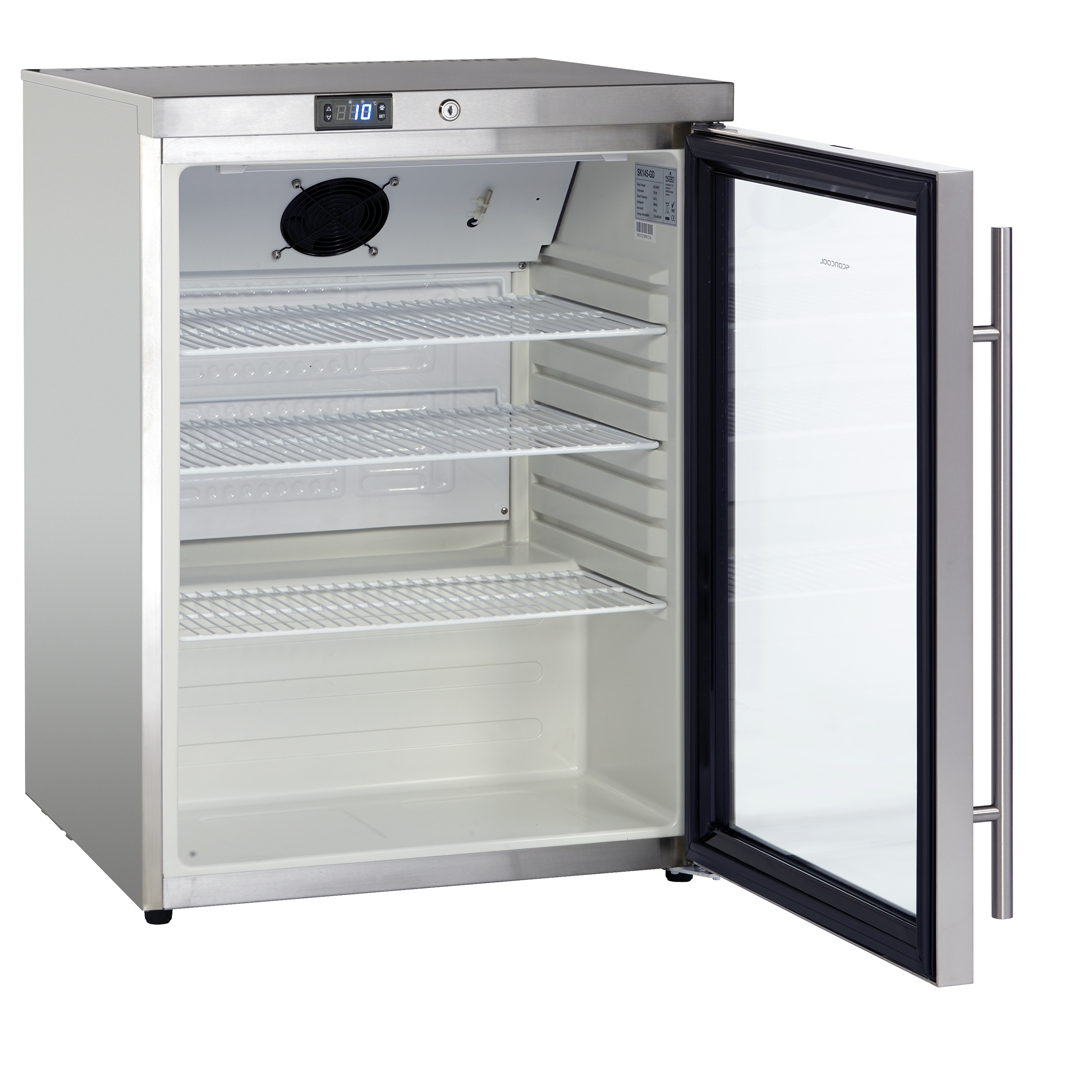 SK 145 GDE er et 1-dørs lagerkøleskab, med rustfri kabinet og glasdør på 145 netto liter.