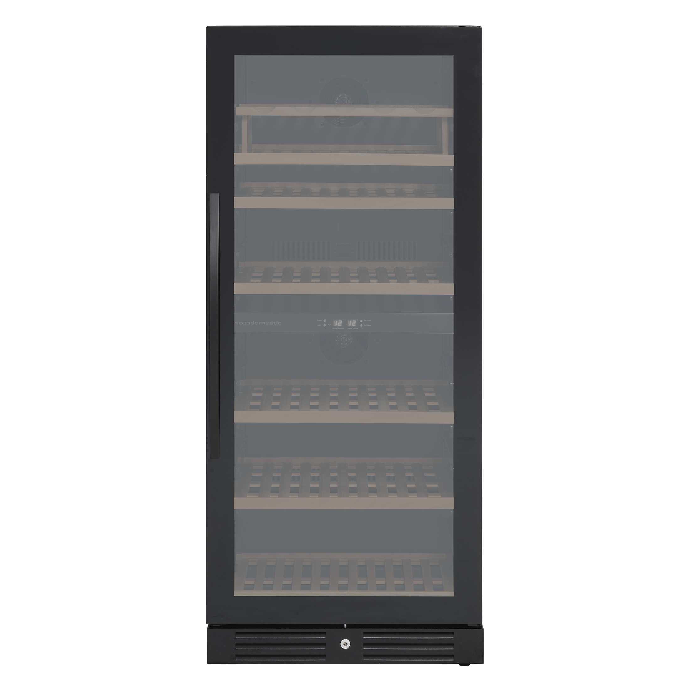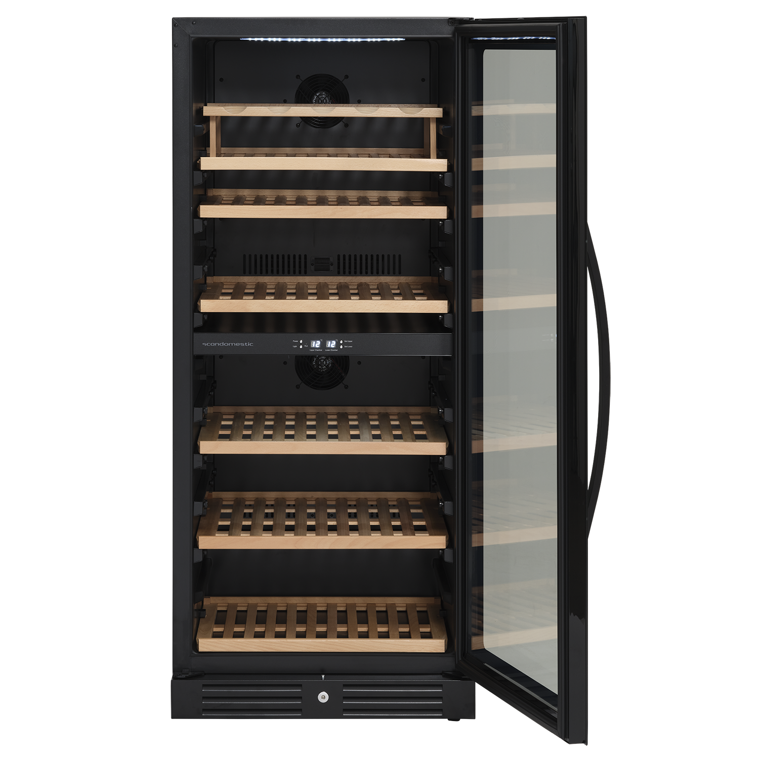 2 horisontale LED lys giver et godt lys og repræsenterer vinen flot. Skabet har luftcirkulationssystem, som sikrer perfekt ventileret, anti-vibrationskøling i hele skabet.