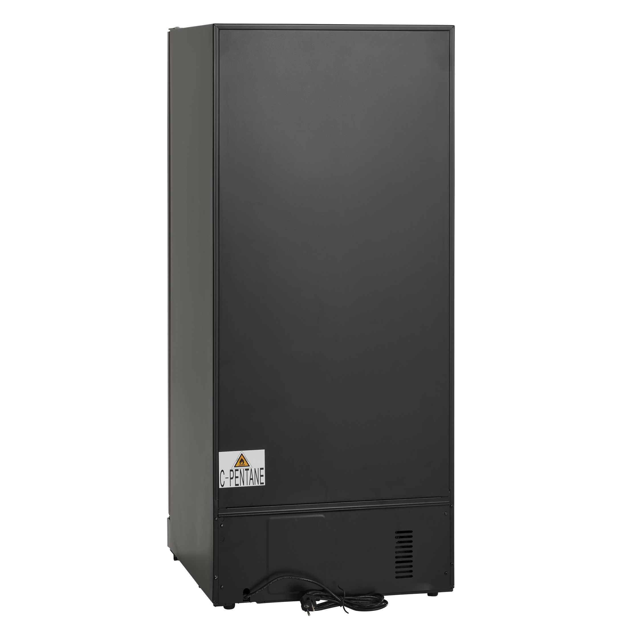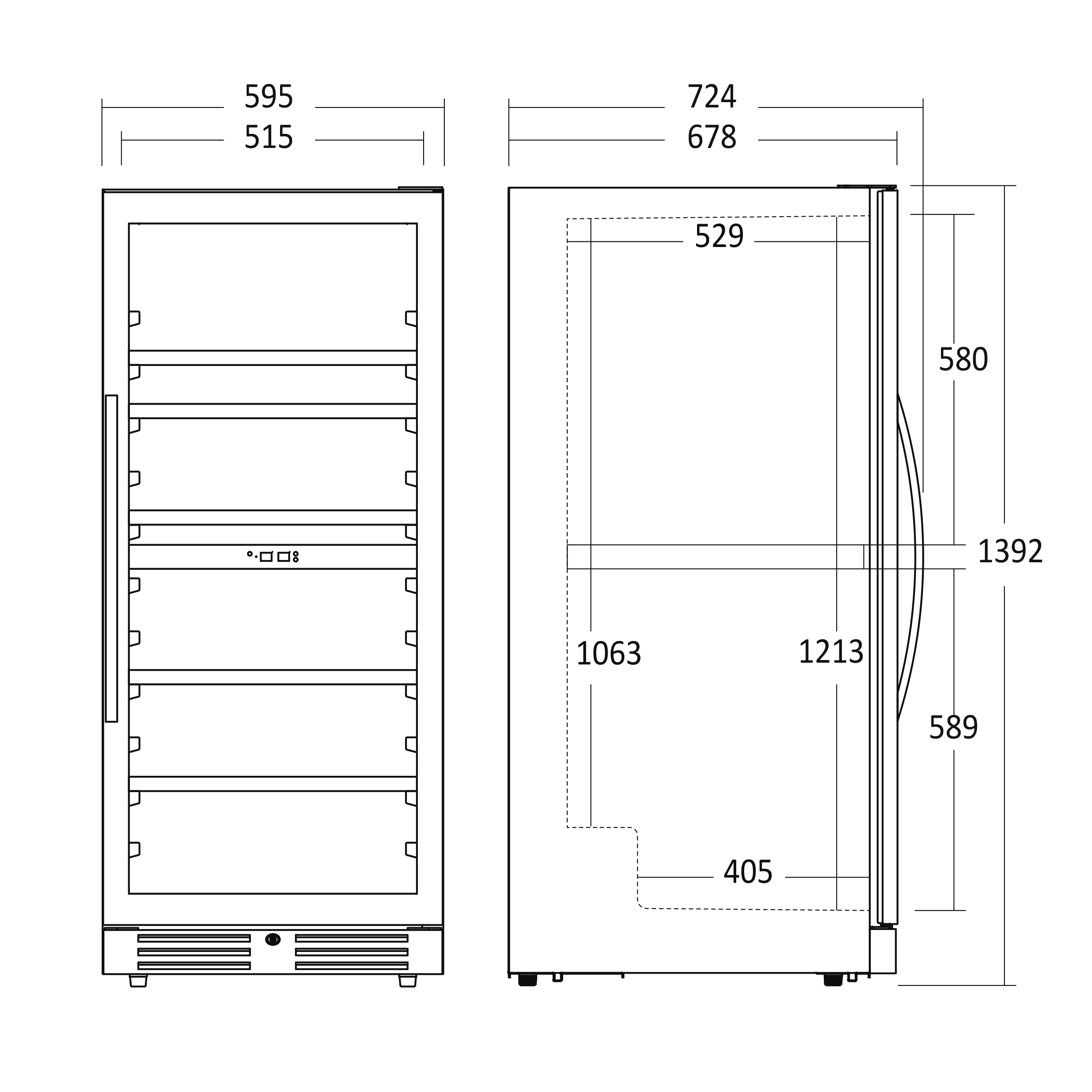 Skabet har et tidløst design, hvor dørrammen i rustfrit stål og det indvendige lys giver skabet et eksklusivt udtryk. Højre hængslet dør med mulighed for dørvending, så det altid er fleksibelt at placere vinskabet i rummet.