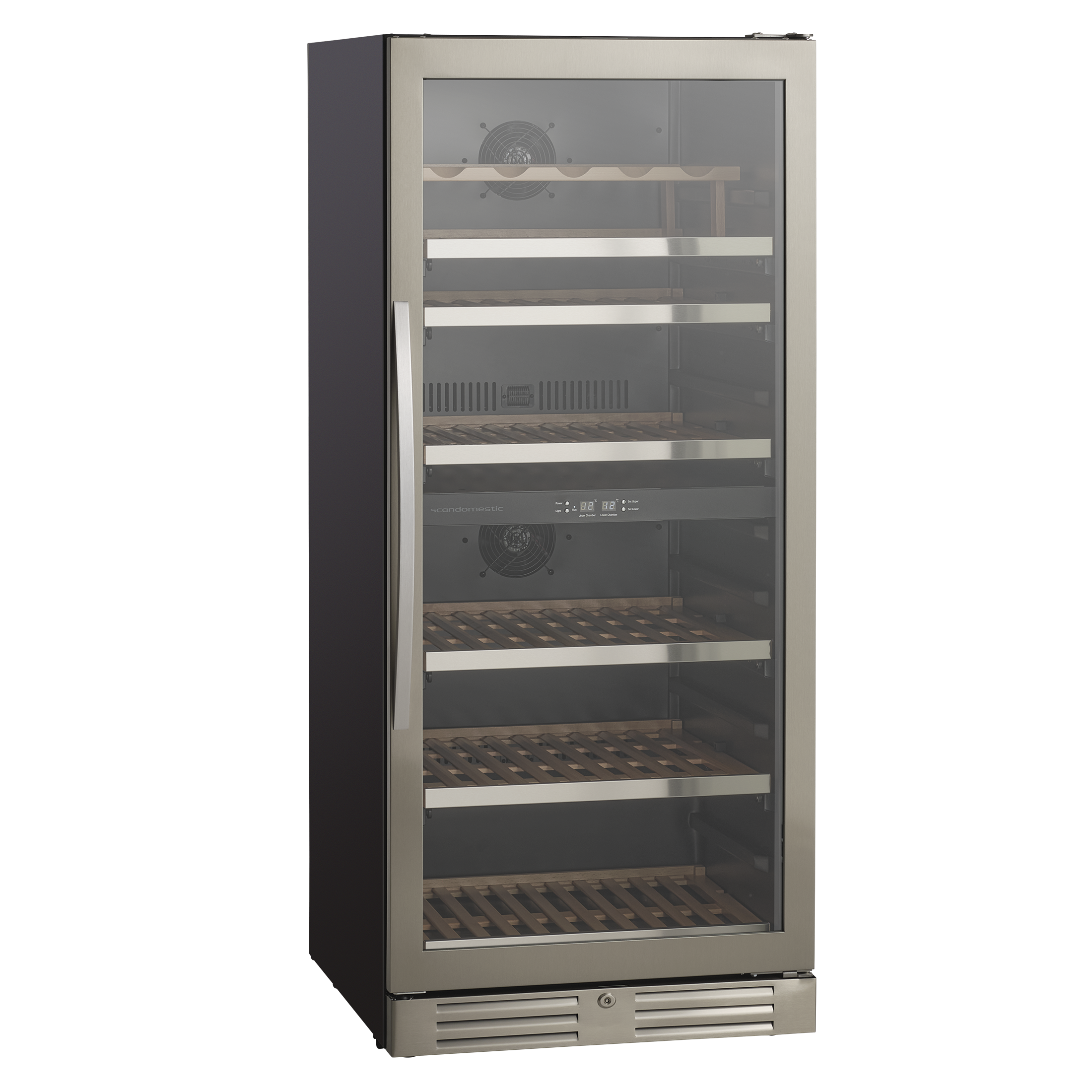 SV 104 X kan bruges til både indbygning og som fritstående vinskab. Skabet har to zoner, kan indstilles mellem 5°C – 18°C uafhængigt af hinanden. Skabet kan rumme 90 flasker fordelt på 6 1/2 hylder i bøgetræ med stålfront, heraf 5 1/2 udtrækshylder og 1 stationær. Et flot skab til opbevaring af dine flasker.