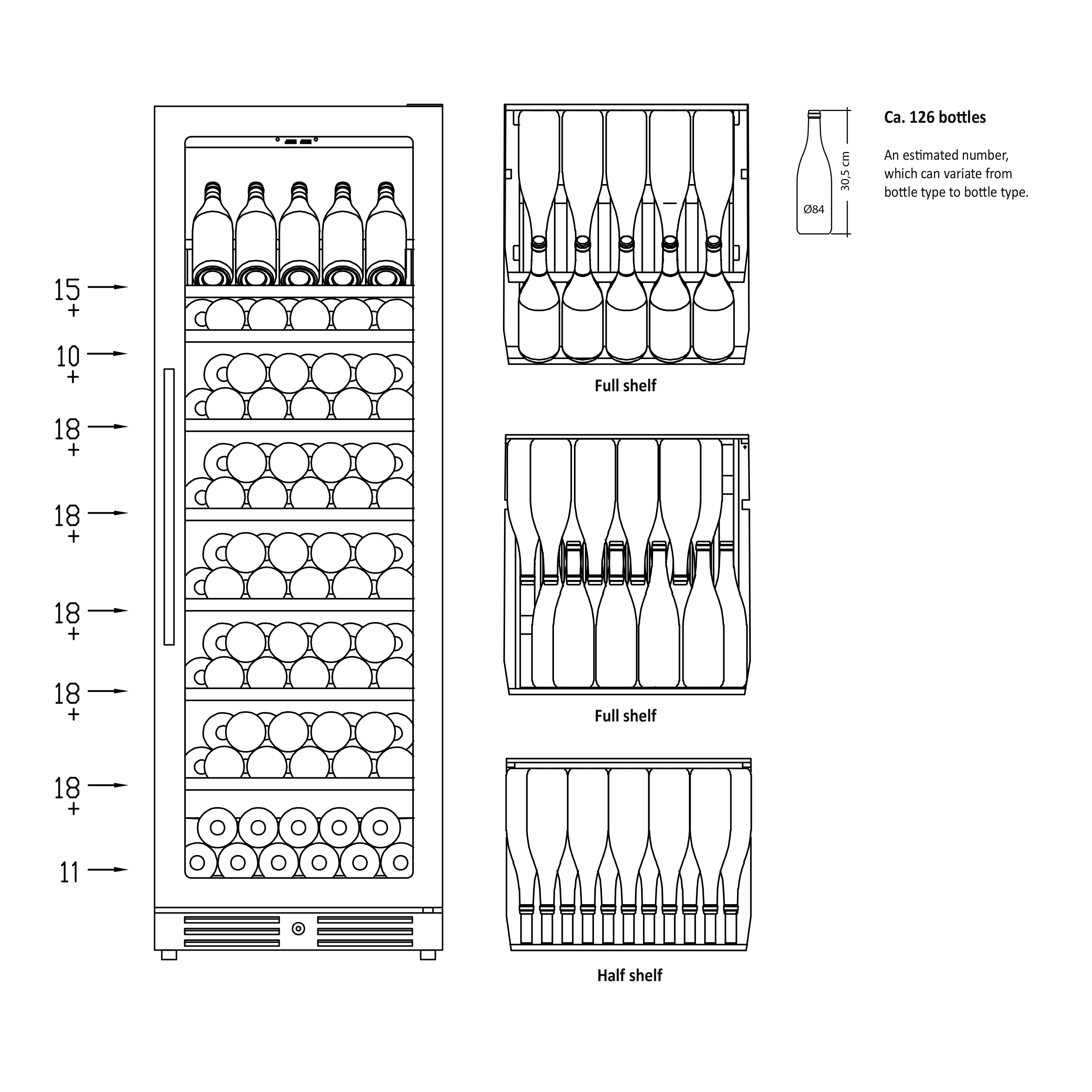 SV 111 B kan bruges til både indbygning og som fritstående vinskab og skabet har én zone. Skabet kan indstilles mellem 5°C – 18°C og kan rumme 126 flasker fordelt på 8 1/2 hylder i bøgetræ, heraf 7 1/2 udtrækshylder og 1 stationær. Et flot skab til opbevaring af dine flasker.