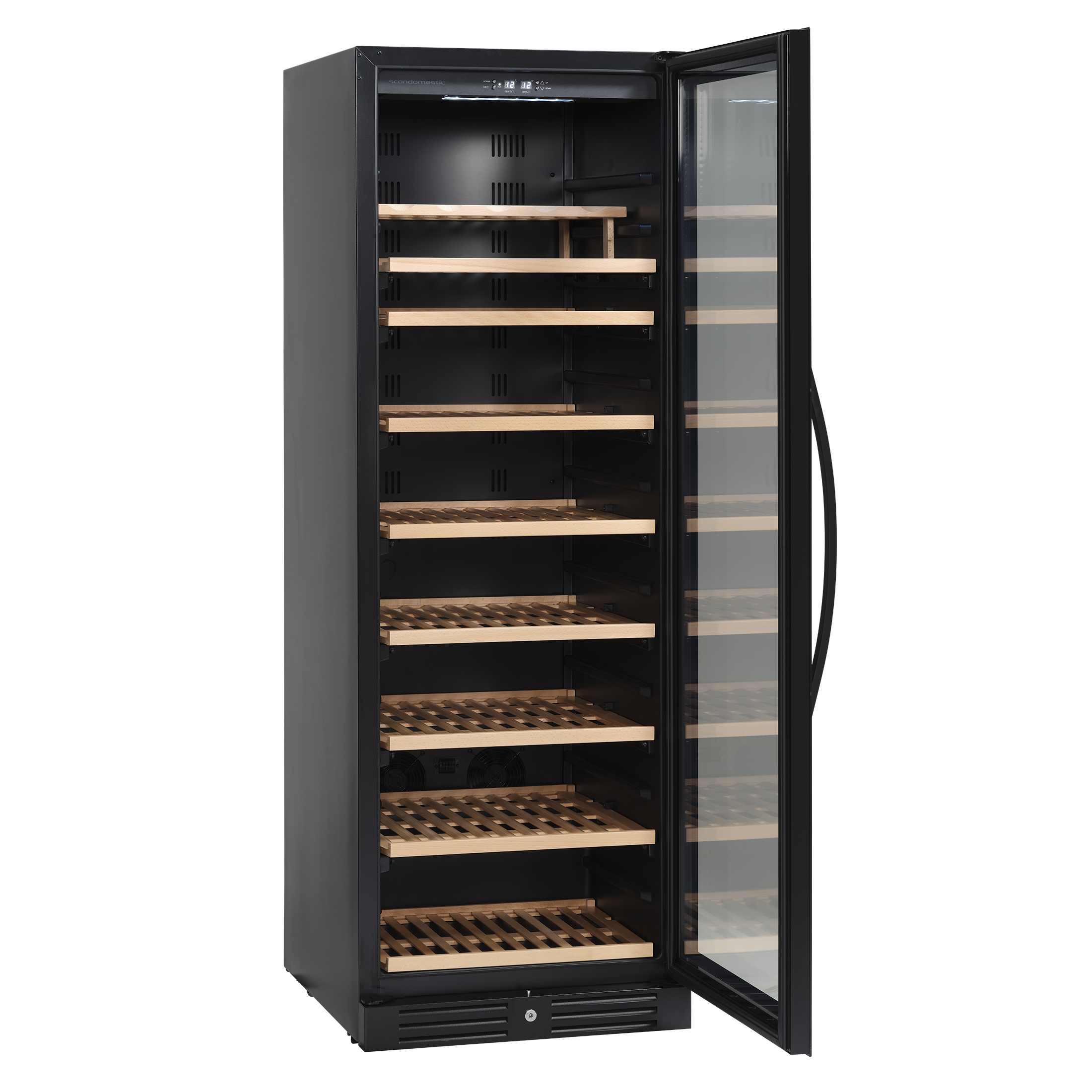 Skabet har et tidløst design, hvor den sorte rammeløse glasdør og det indvendige lys giver skabet et eksklusivt udtryk. Højre hængslet dør med mulighed for dørvending, så det altid er fleksibelt at placere vinskabet i rummet.