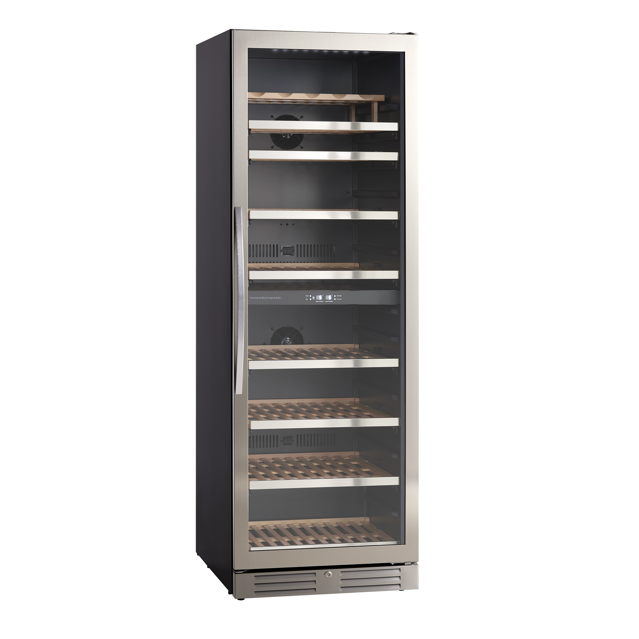 SV 124 X kan bruges til både indbygning og som fritstående vinskab. Skabet har to zoner, kan indstilles mellem 5°C – 18°C uafhængigt af hinanden. Skabet kan rumme 126 flasker fordelt på 7 1/2 hylder i bøgetræ med stålfront, heraf 6 udtrækshylder og 1 1/2 stationær. Et flot skab til opbevaring af dine flasker.