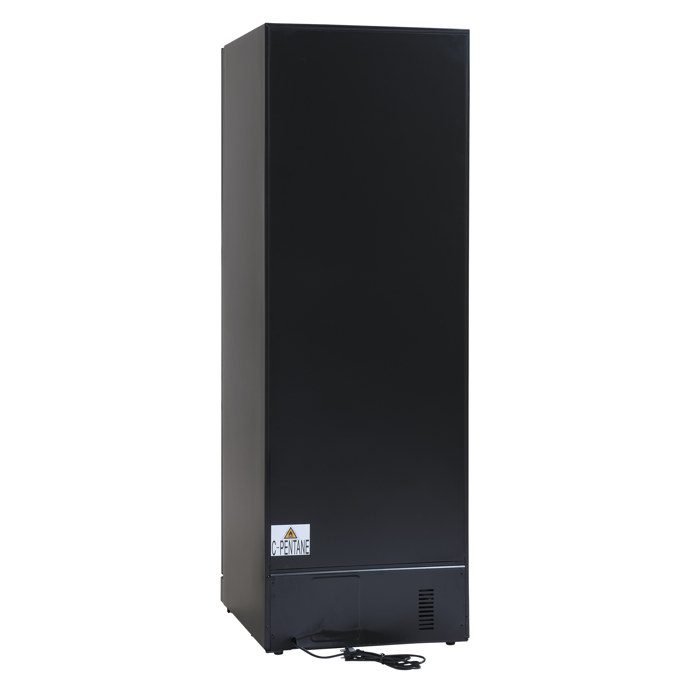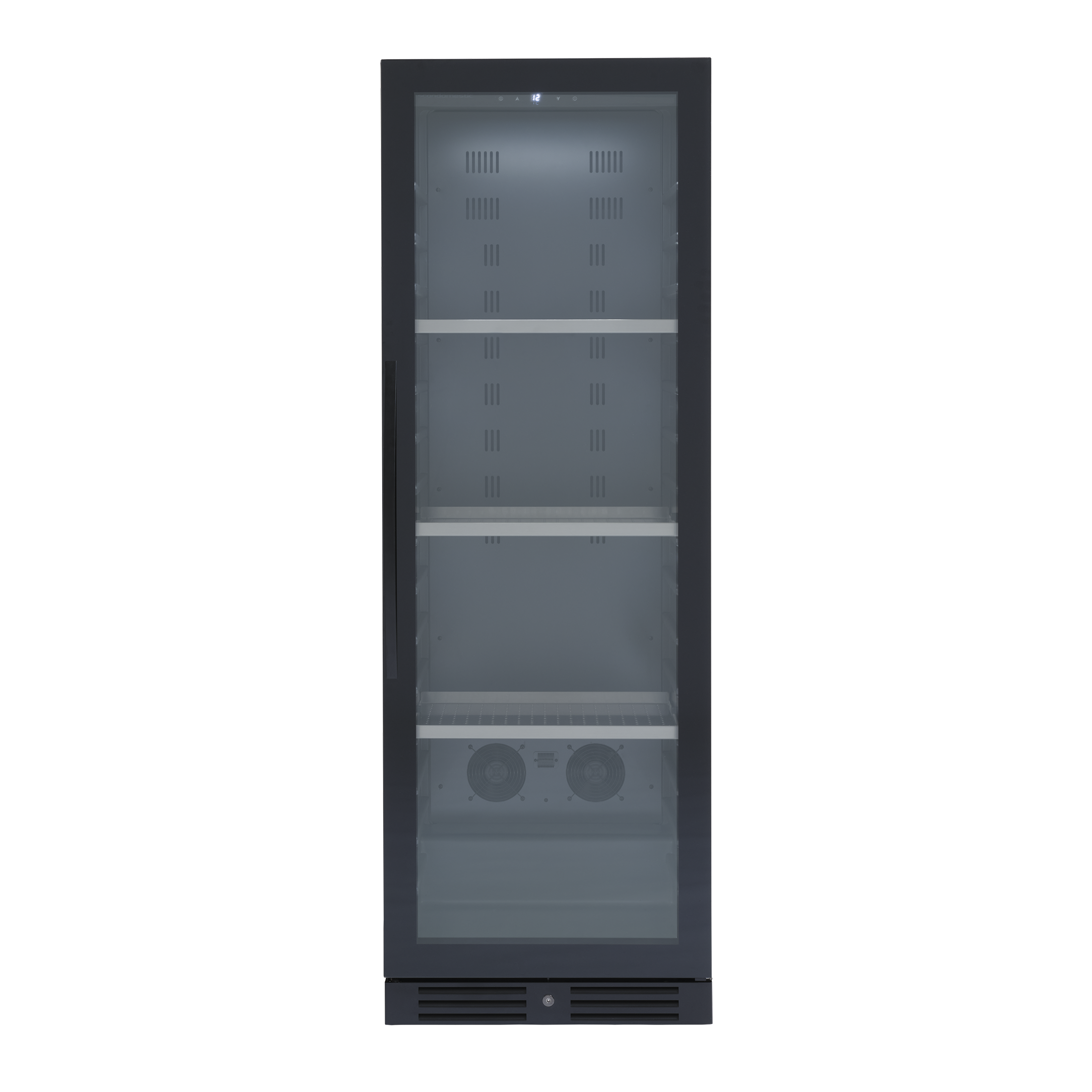 Sort serveringsskab med eksklusiv, rammeløs glasdør med lås. Leveres med 3 kraftige stålhylder til 138 opretstående flasker.