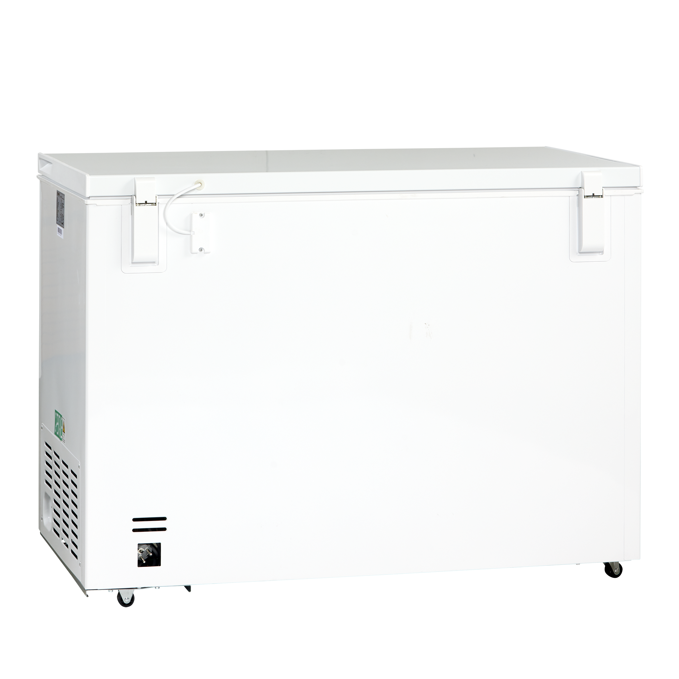Lådan är vit på utsidan med handtag framtill och med fyra hjul vilket gör den lätt att flytta med. När frysen är stängd ger den också en extra och bra arbetsplats med det hållbara lutande locket.