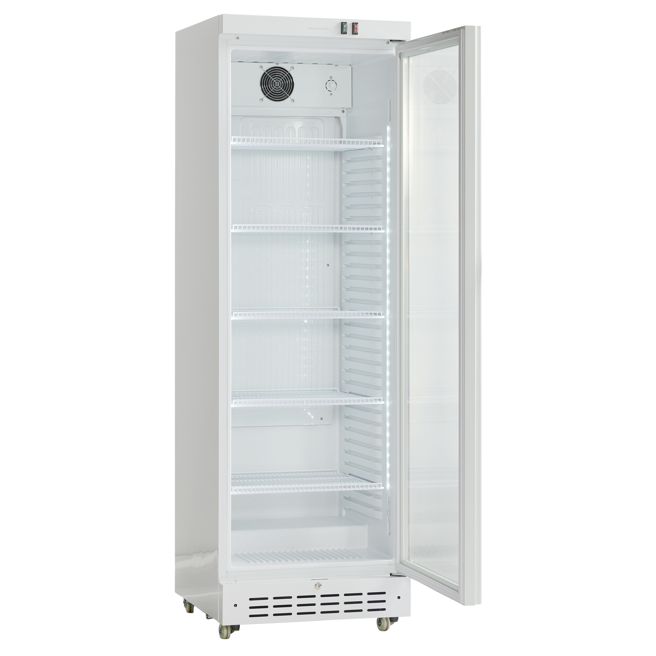 DC389WD är en stor 1-dörrars displaykyl i vitt, med 360 nettoliter kylförvaring.