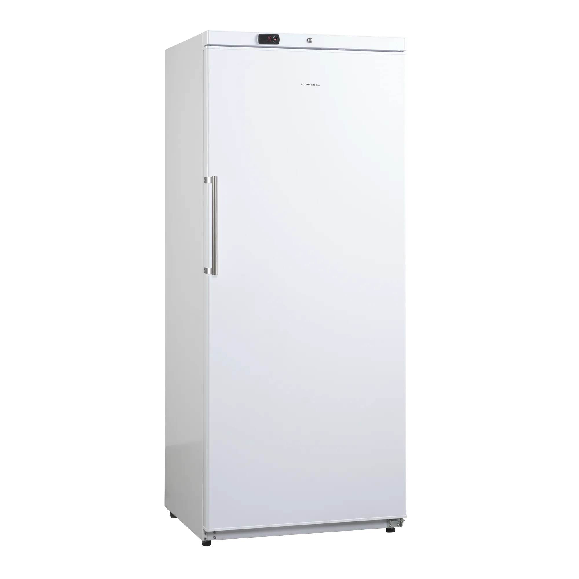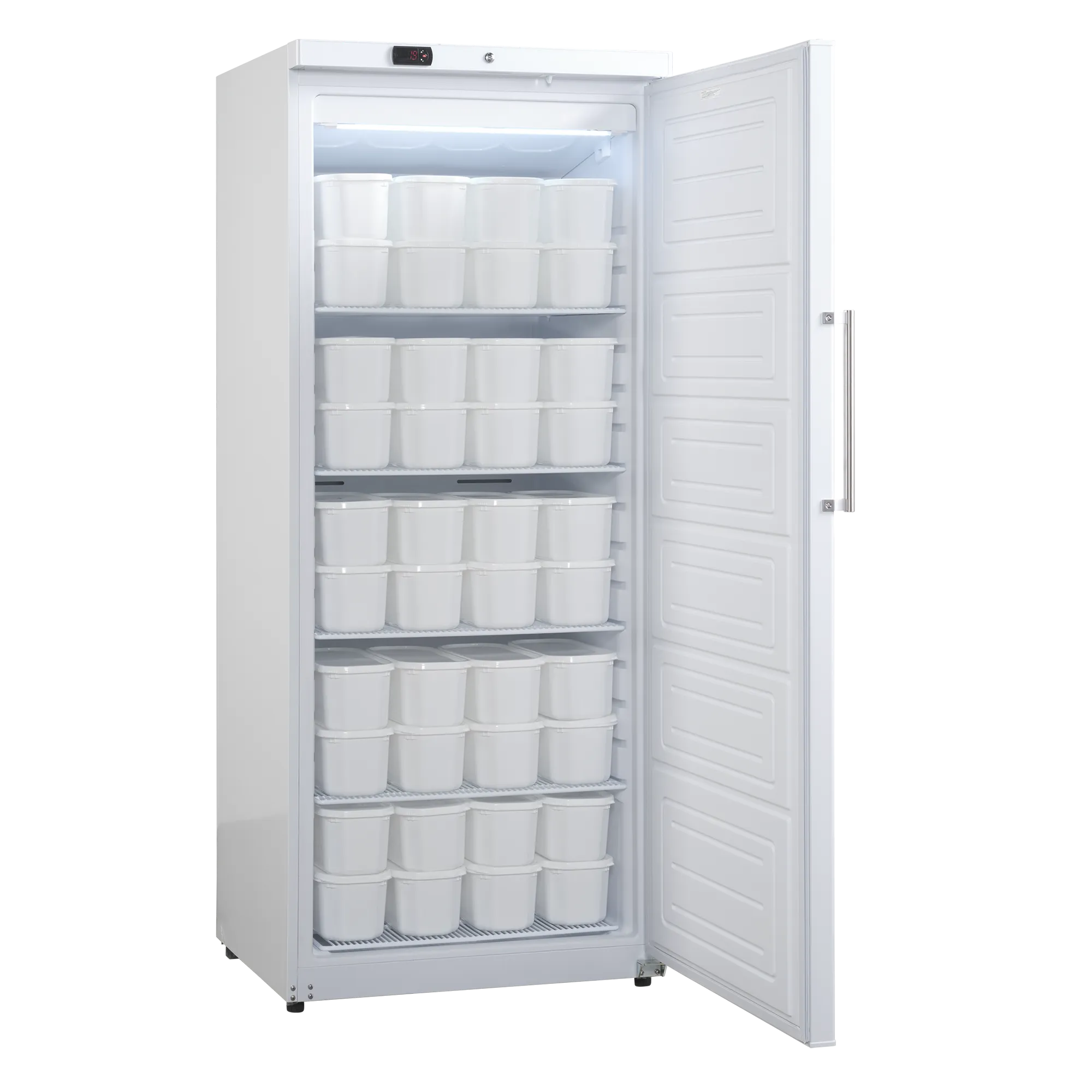 GUF590 W är en frys på 510 nettoliter med en hel dörr med en vändbar dörr och ett robust stålhandtag.
