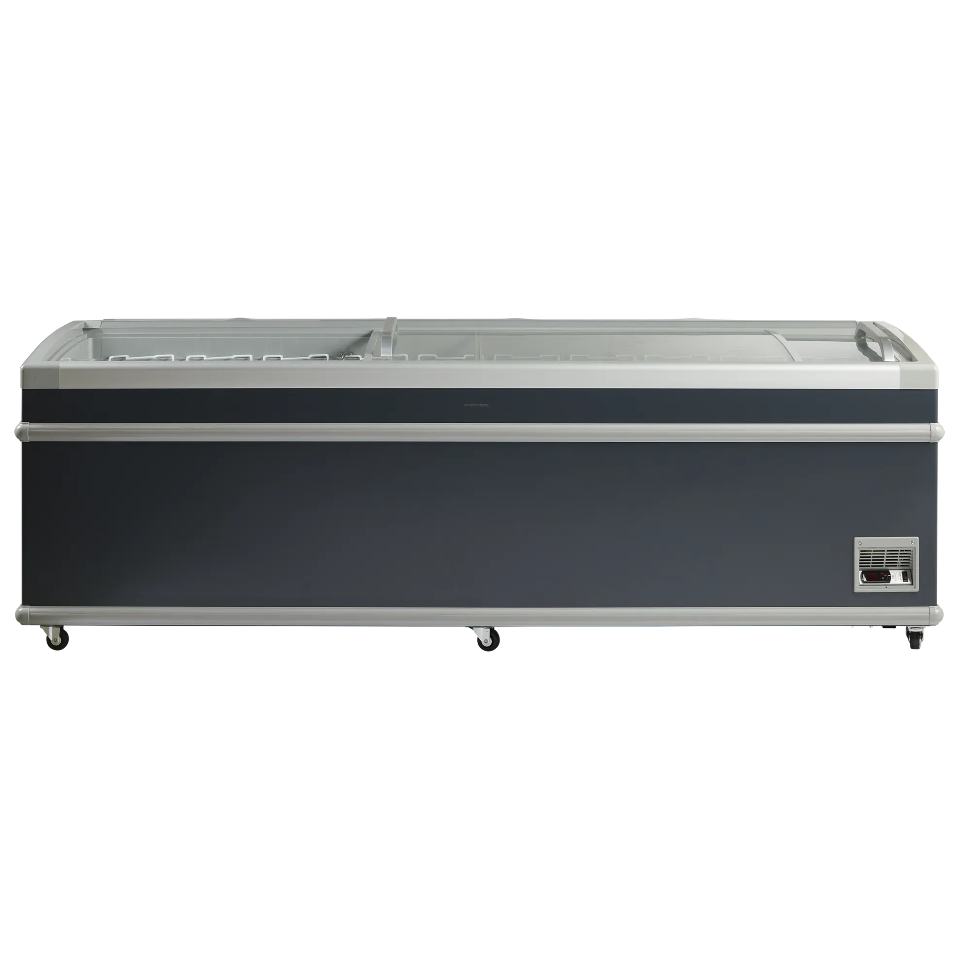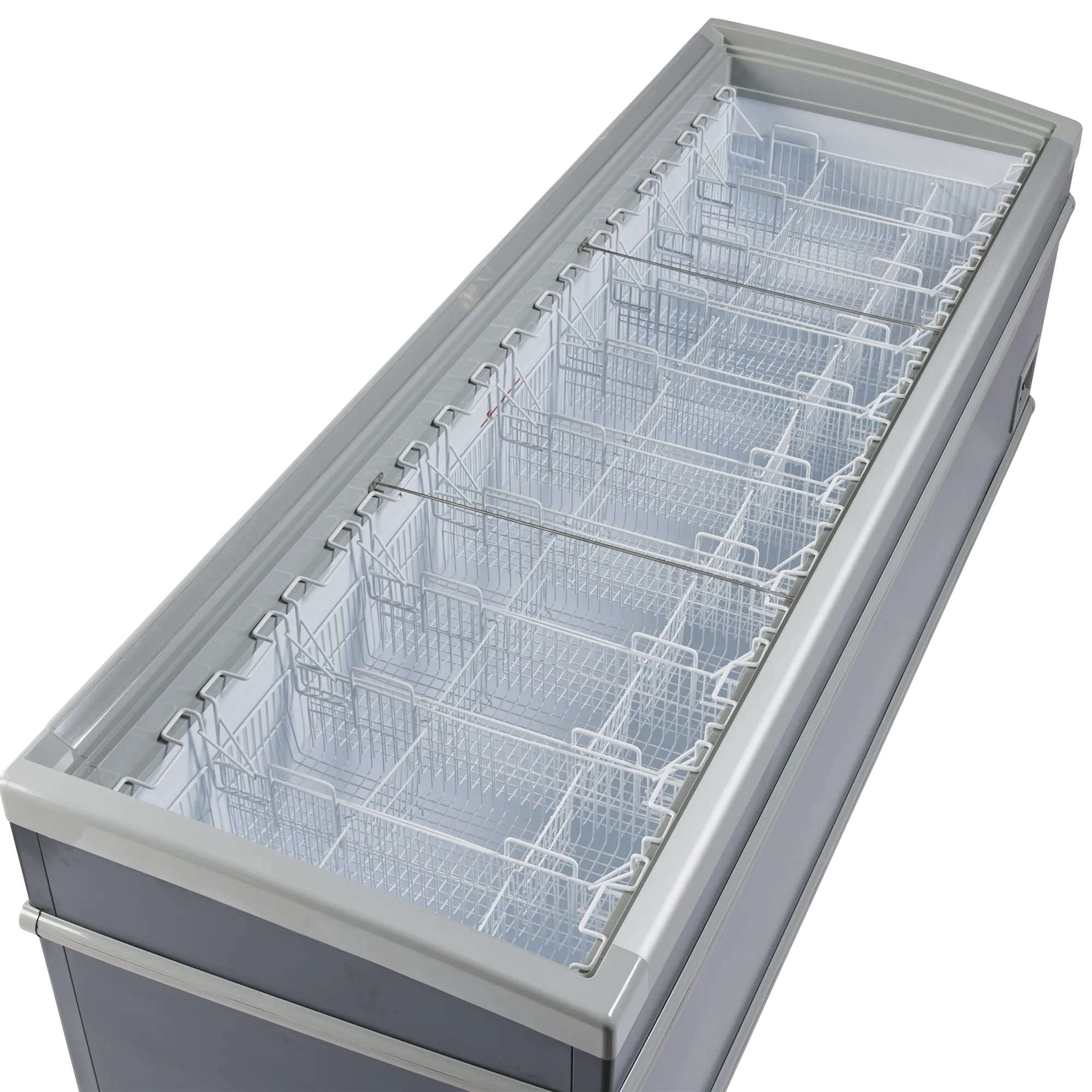 Förstklassig design med mjuka och runda hörn. Frysen levereras med böjda transparenta skjutlock som håller extra på kylan och med starka aluminiumhandtag.