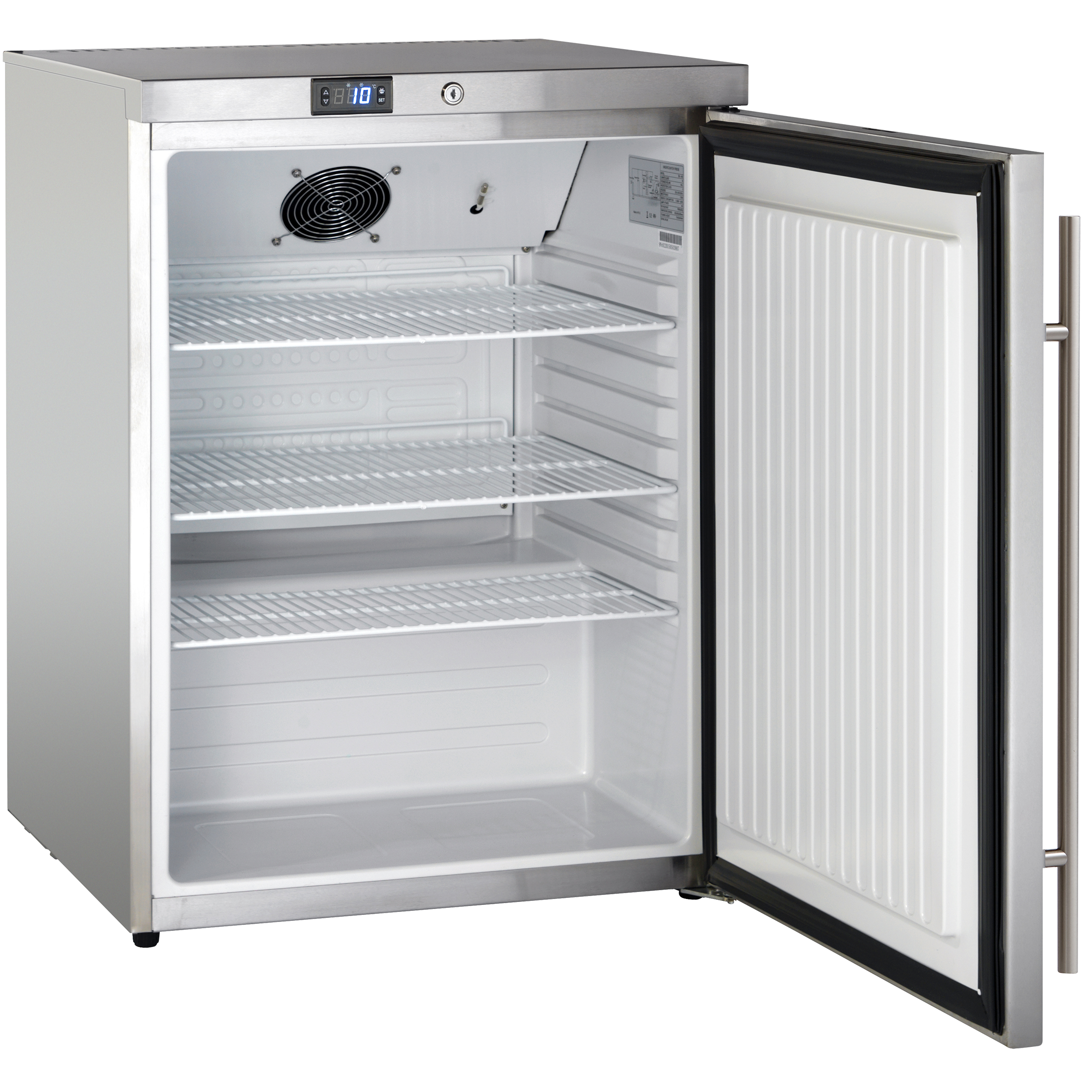 SK 145 E har ventilerad kylning som gör att kylan alltid är jämn på alla hyllor. Skåpet är elektroniskt styrt och har en extern kontrollpanel och display så att det är lätt att se och justera temperaturen i skåpet.
