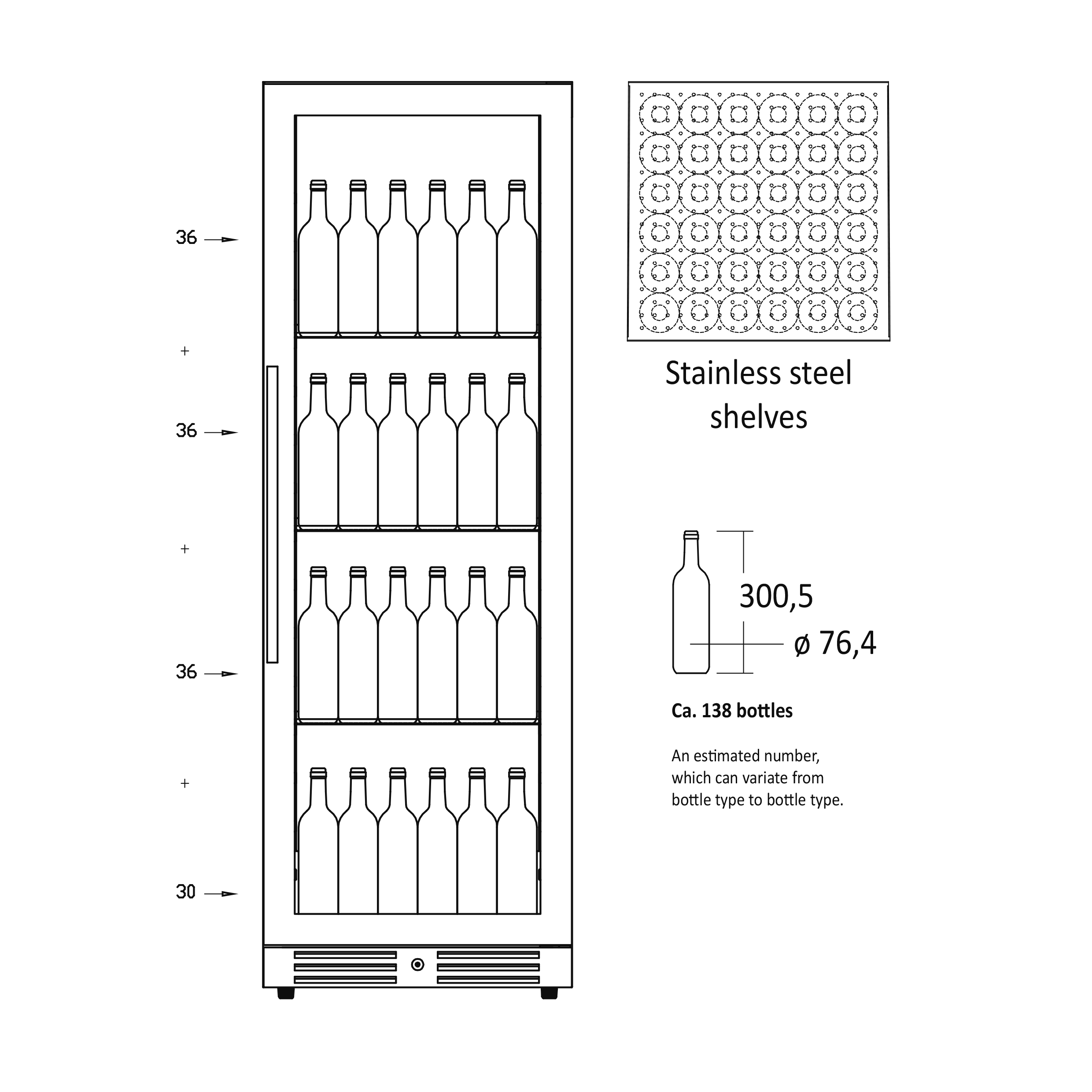 SV 138 B kan användas som ett inbyggt eller fristående serveringsskåp. Skåpet har en zon, kan justeras mellan 5°C - 18°C och rymmer 138 stående flaskor på 3 stålhyllor. Ett vackert skåp för att visa upp dina flaskor.