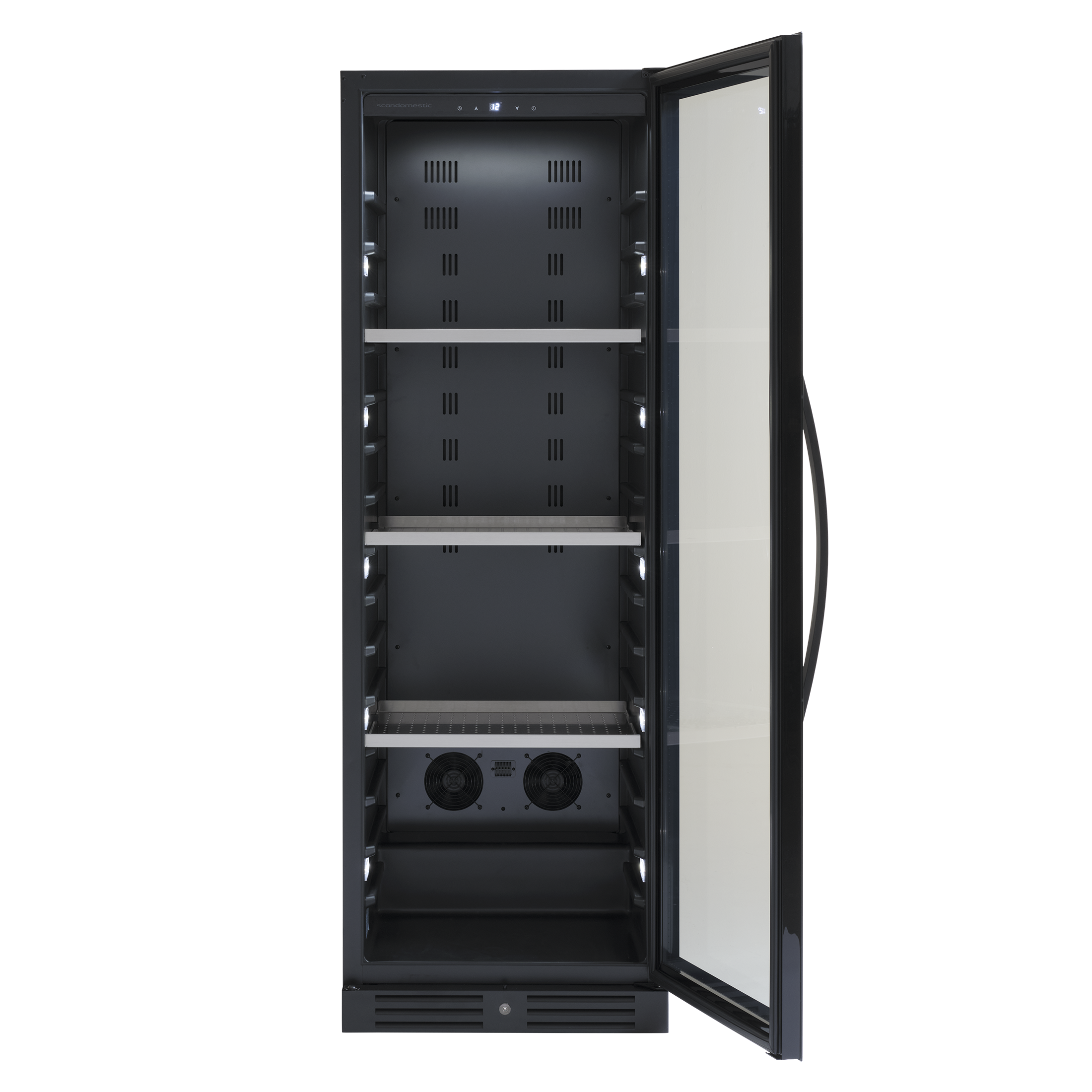 Svart serveringsskåp med exklusiv ramlös glasdörr med lås. Levereras med 3 kraftiga stålhyllor för 138 stående flaskor.