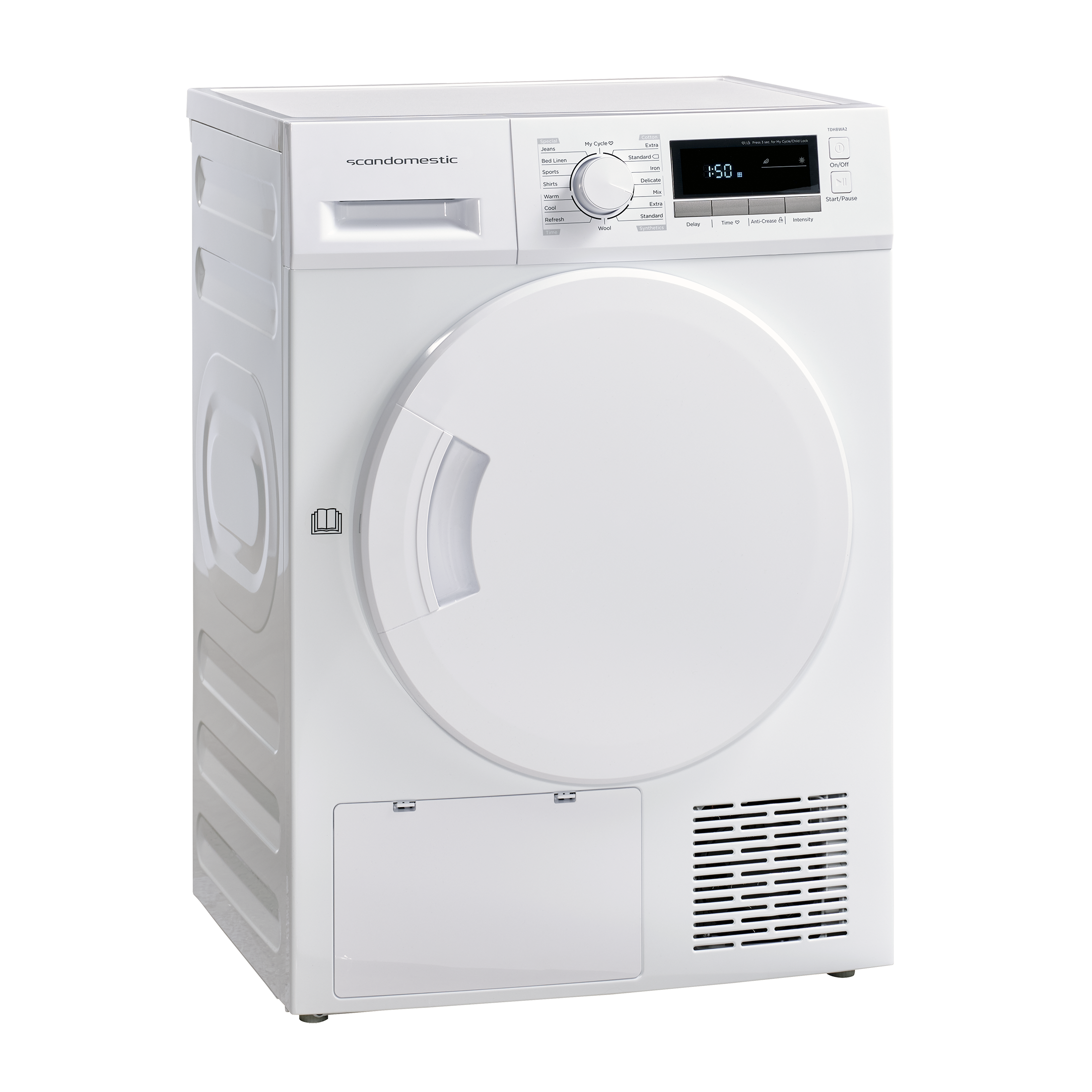TTH8WA2 har totalt 16 program och möjlighet till tidsstyrning. Vid användning av de elektroniska programmen körs maskinen aldrig längre än nödvändigt när kläderna är torra, vilket sparar både tid och energi. Dessutom är det möjligt att spara ditt favoritprogram (Min cykel) så att det enkelt kan väljas när du vill använda det.