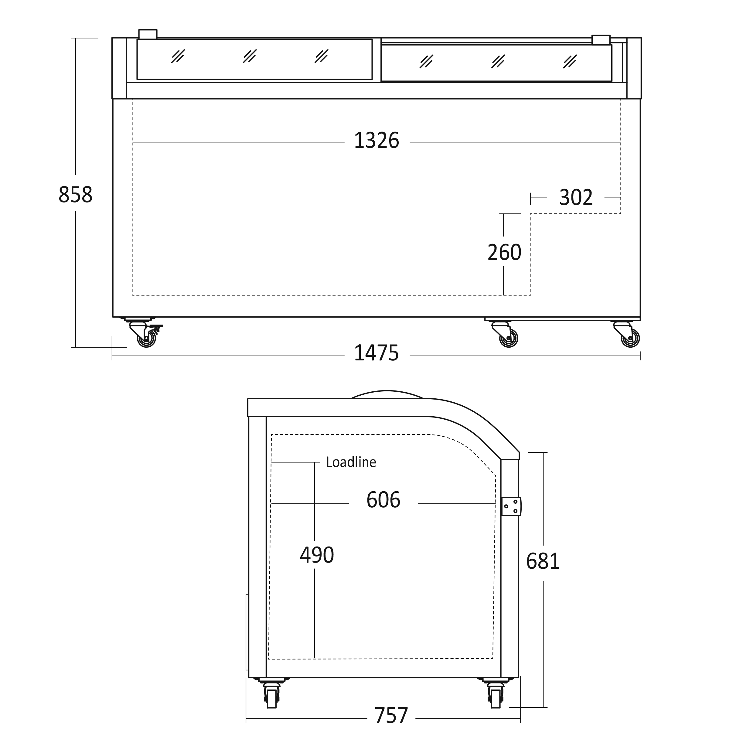 Indvendige mål, HxBxD, mm: 490 x 1326 x 606
